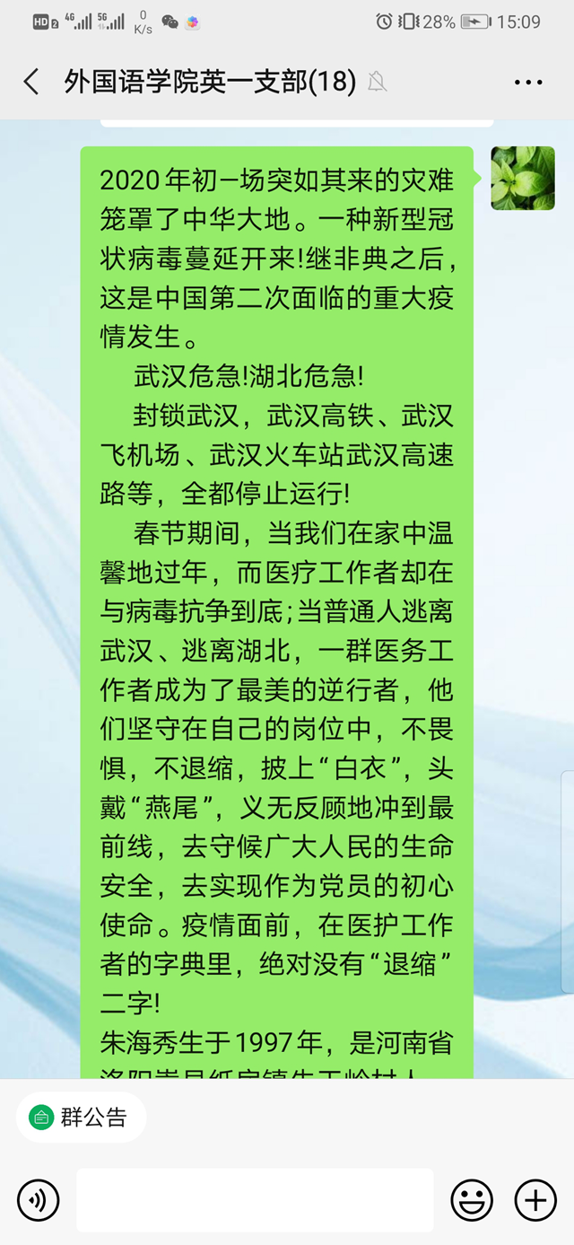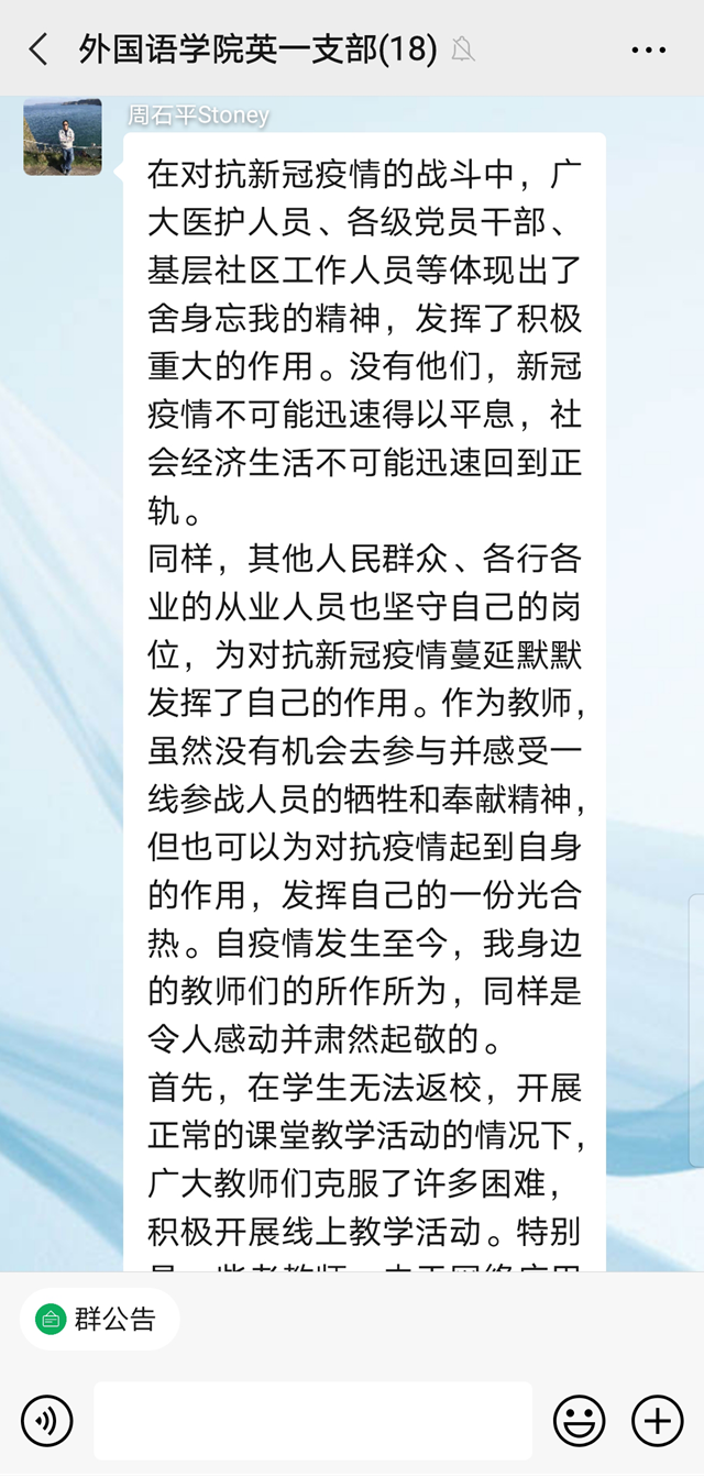 在会议的最后,党员教师积极踊跃发言,分享了自己所知道的战疫故事。其中,李伟芳老师讲到,新冠肺炎疫情在全球的肆虐,使我们更清楚地认识到在当今全球化时代,战胜疫情是所有人共同的责任。在这场空前绝后的战疫中,中国共产党领导的中国政府采取有力的防控措施遏制疫情蔓延势头,同时推动复工复产有序进行。中国共产党领导下的中国政府和中国人民在此次战疫中展现的能力、意志、决心与担当令世界动容。马珂老师就投身武汉抗疫工作的党员朱海秀的事迹发表了自己的感想:“我们相信在党中央的坚强领导和全国人民的共同努力下,没有任何困难能够打败中国人民,我们必将取得这场疫情战的最后胜利。”