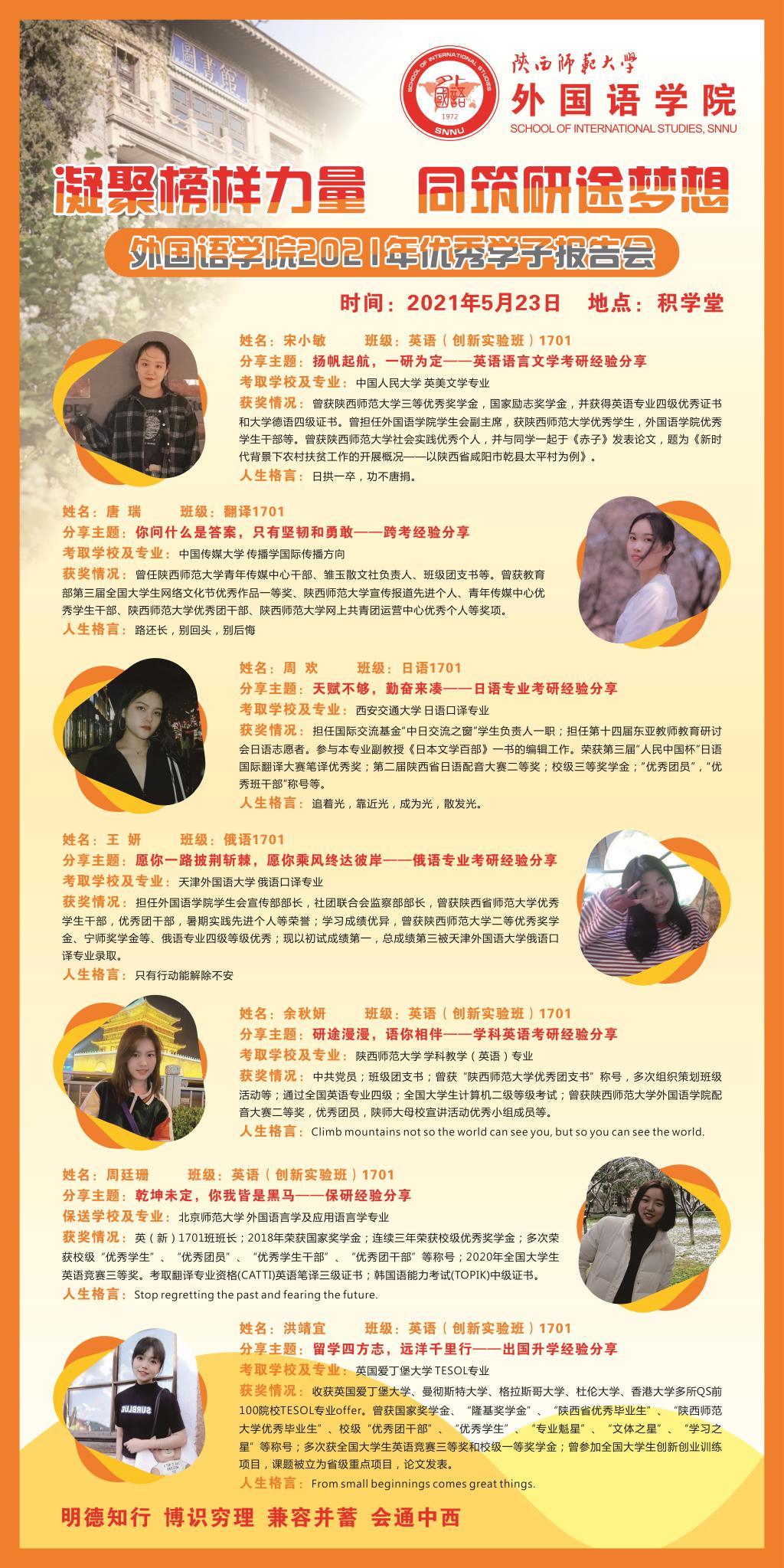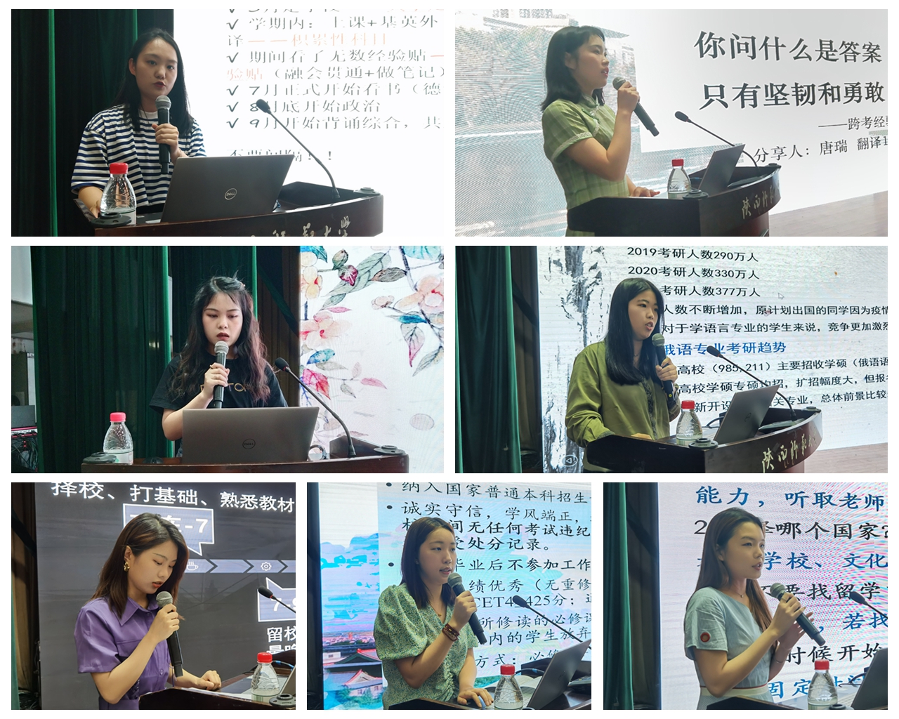英创1701班宋小敏同学以“扬帆起航,一研为定”为主题回顾了自己的考研过程,建议同学们保持良好心态,制定相关计划;翻译1701班唐瑞同学以“你问什么是答案,只有坚韧和勇敢”为主题分享了自己的大学四年期间以及最后决定跨专业考研的心路历程,鼓励同学们要敢去想,敢去试,勇于拼搏;日语1701班周欢同学以“天赋不够,勤奋来凑”为主题就要不要考研、如何择校、考研时间安排等问题进行了解答,并针对各科复习要点向大家推荐了一些学习资源,希望大家都能到达想去的地方;俄语1701班王妍同学以“愿你一路披荆斩棘,愿你乘风终达彼岸”为主题分享了自己的考研过程以及初复试经验,还分析了近年考研的趋势,她希望同学们能够不负青春,努力奋斗,勇敢追梦;英创1701班余秋妍同学以“研途漫漫,语你相伴”为主题分享了自己的择校经验与时间安排,为同学们的时间规划提供了诸多建议,并向同学们说明了考研容易出现的心态问题以及解决方法;英创1701班周廷珊同学以“乾坤未定,你我皆是黑马”为主题介绍了保研的条件以及前期准备,分析了不同的保研方式,同时分享了自己参加不同公司口试及面试的经验,建议大家提前做好准备,不要过度焦虑;英创1701班洪靖宜同学以“留学四方志,远洋万里行”为主题,为同学们解答了出国留学的相关问题,分享了自己的留学经验。