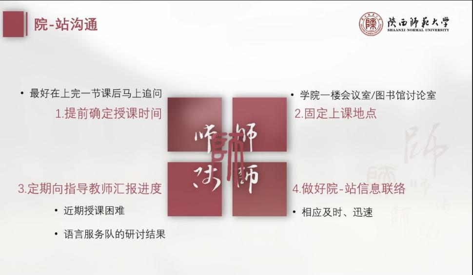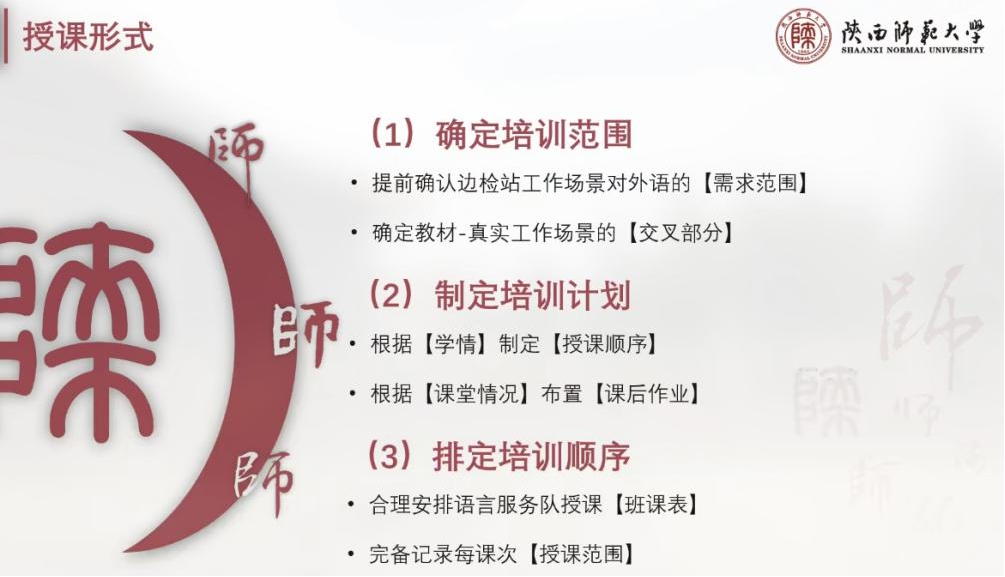 半年多的时间,语言服务队不断发展壮大,MTI中心副主任巢玥先后选拔8位获得教团队格证、英语专业八级证书、全国翻译专业资格考试证书的硕士生以及9位获得教团队格证、英语专业四级成绩达到优秀等次的本科生加入授课队伍。语言服务队授课前需先接受红站语言服务队老队员的培训,形成“老带新”的滚动式语言服务体系,以期建立beat365服务边疆边检事业的传统。这17名队员思想政治过硬,怀抱教育报国情怀,积极参与集体备课和课后反思,彰显beat365“红色翻译”和“经典翻译”的学科特色,践行beat365官方网站“红烛苗圃”实践育人品牌项目的核心精神。