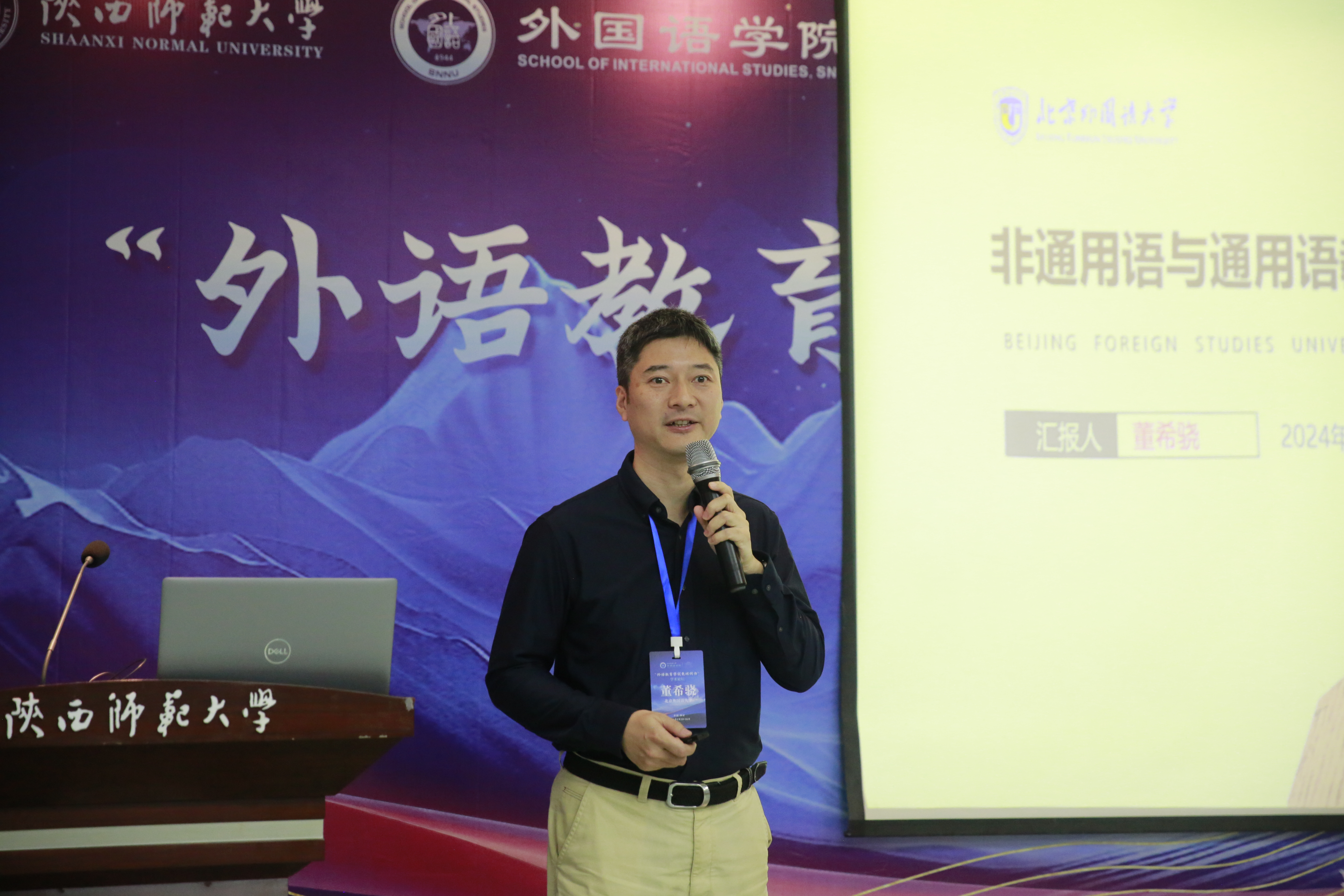 董希骁教授在题为《非通用语与通用语教育的共性与个性分析》的报告中,阐释了非通用语的定义及其内部差异,指出所有语种教育共同的本质属性和外语教育过程的三个核心环节:驱动、促成、评价。董教授进一步探讨了非通用语教育在服务国家需求、团队队伍建设和评价标准完善方面面临的重难点,并着重强调外语教育学科发展对于明确教育方向、整合资源以及迎接共同命运的重要指导意义。