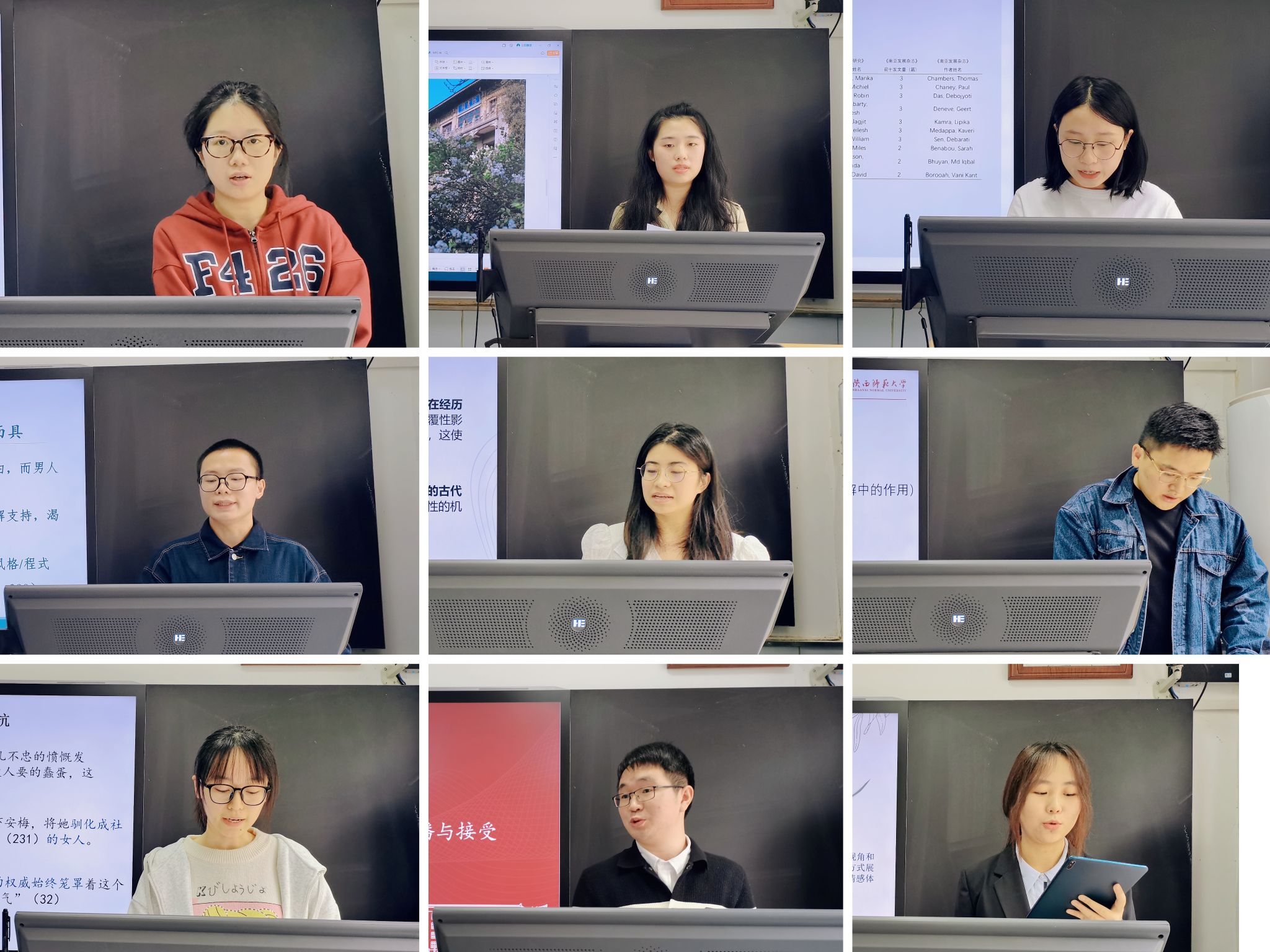 在此次论坛中,九名同学分别从九个方面对不同主题进行了汇报。本科生何诺冉、拓宇欢分别以“泰特勒翻译三原则在散文英译中的应用——以张培基所译《艰难的国运与雄健的国民》为例”和“‘性灵说’对林语堂翻译活动的影响”为题进行了汇报。硕士研究生马莎、刘丹妮和张予诺分别以“目的论视角下的《古文观止》四字词语翻译研究”“On the English Translation of Culture-loaded Words in The Youth of a Great Man—Zhu De (Chapters 1-5) from the perspective of Functional Equivalence Theory”和“意象图式视角下李清照词英译本研究”为题进行了汇报。博士研究生李文玉、丁礼明、马媛、刘岚分别以“中国特色话语多模态对外译介的‘厚译’路径研究”“林语堂《板桥家书》英译中的文化记忆建构研究”“第三空间视角下林语堂《虬髯客传》的翻译接受研究 ”“ 张申府对西方语言哲学思想的译介与会通”为题分享了自己的研究内容。两位评委老师认真聆听,在肯定选手们精彩表现的同时,还就相关研究提出问题,给予了具有针对性的宝贵建议。