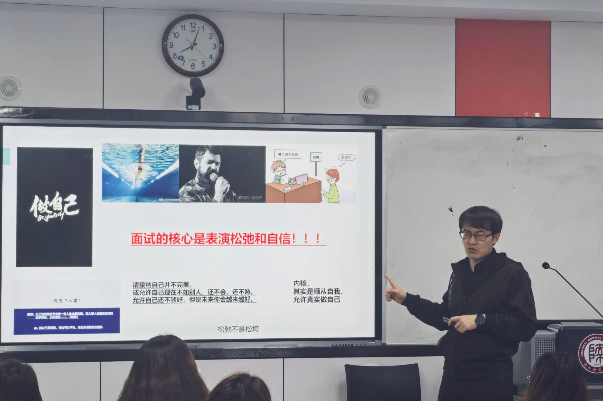 讲座于当天下午19:30准时开始。魏东昀老师首先以深入浅出的方式介绍了面试中的“技法”,包括如何做好求职面试的准备工作、如何准备简历、如何应对面试中的常见问题以及如何在面试中展示自己的优势等。他强调了面试前的充分准备和面试过程中的自信表现对于成功求职的重要性。