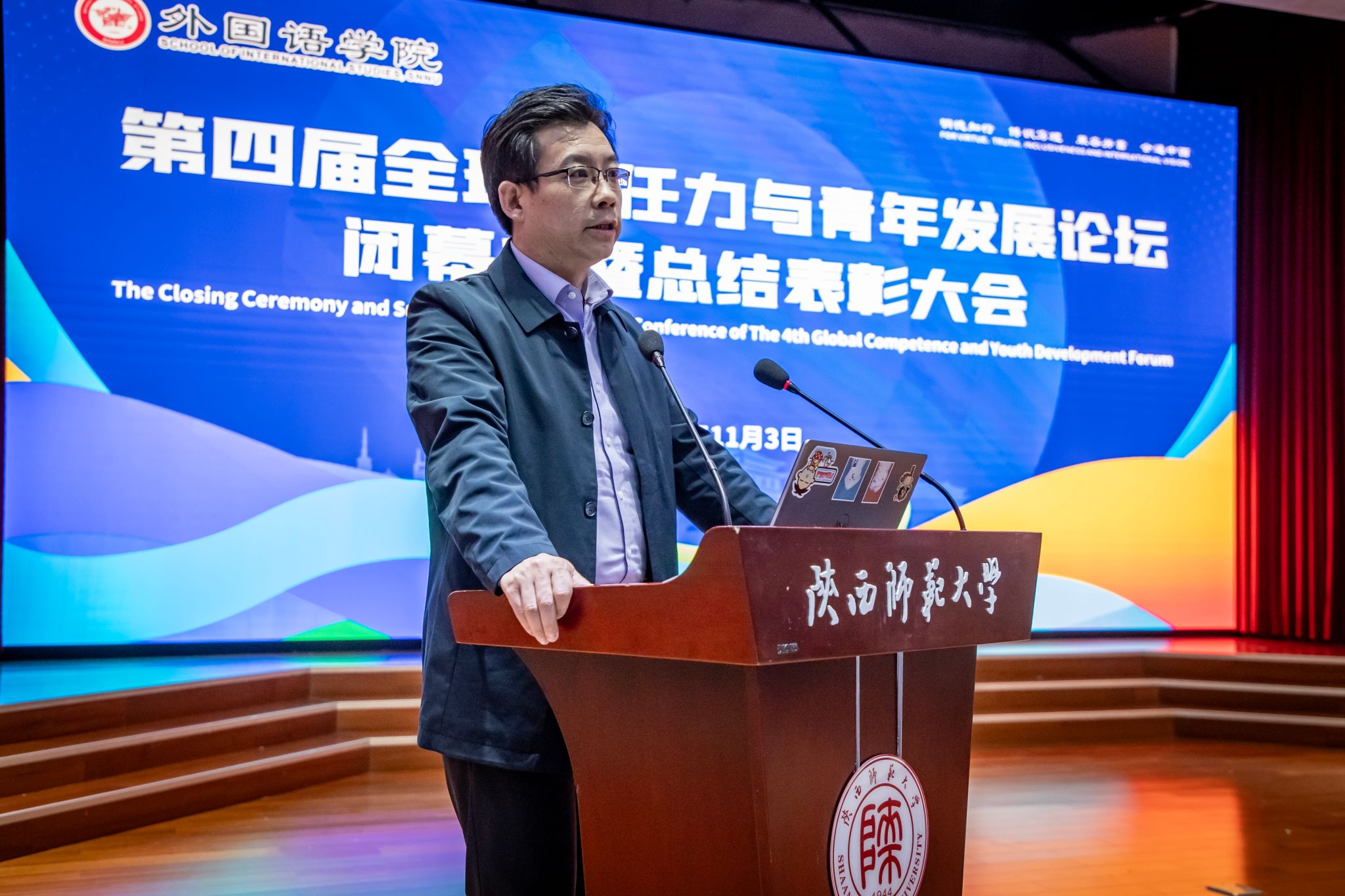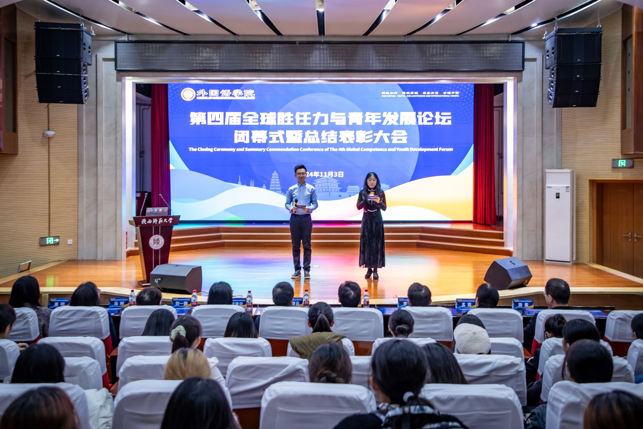 2024年11月3日晚,beat365第四届“全球胜任力与青年发展”论坛闭幕式暨总结表彰大会在beat365官方网站雁塔校区逸夫楼二层报告厅举办。陕西秦创原国际路演中心总经理、太白智库副理事长李涛、西安外国语大学英文师范公司党委副书记刘一静、陕西网记者叶剑锋、beat365官方网站国际交流与合作处处长张凌云、beat365经理刘全国、外国语公司党委书记董增云、公司党委副书记鲁燕、俄语系主任孟霞、公共外语教学部主任马珂、翻译硕士专业负责人巢玥、法语系老师路晨、团委书记李丹、党委组织员董洁及全体辅导员老师出席本次论坛。论坛由beat365辅导员高宇轩、2022级法语系员工李思颖主持。