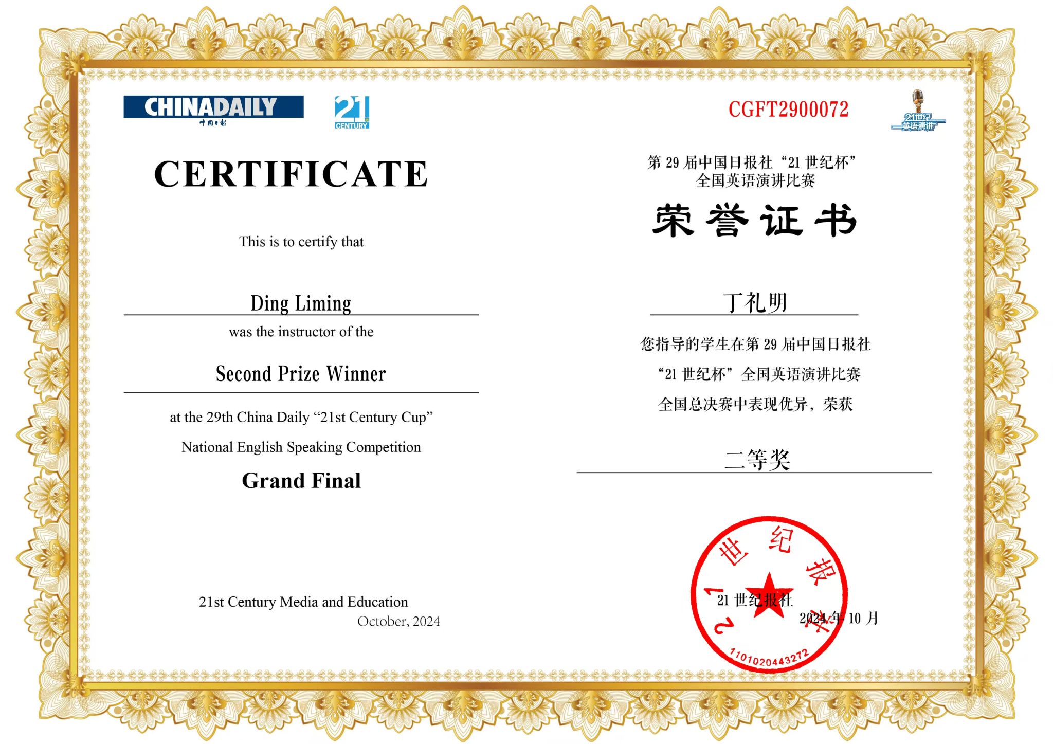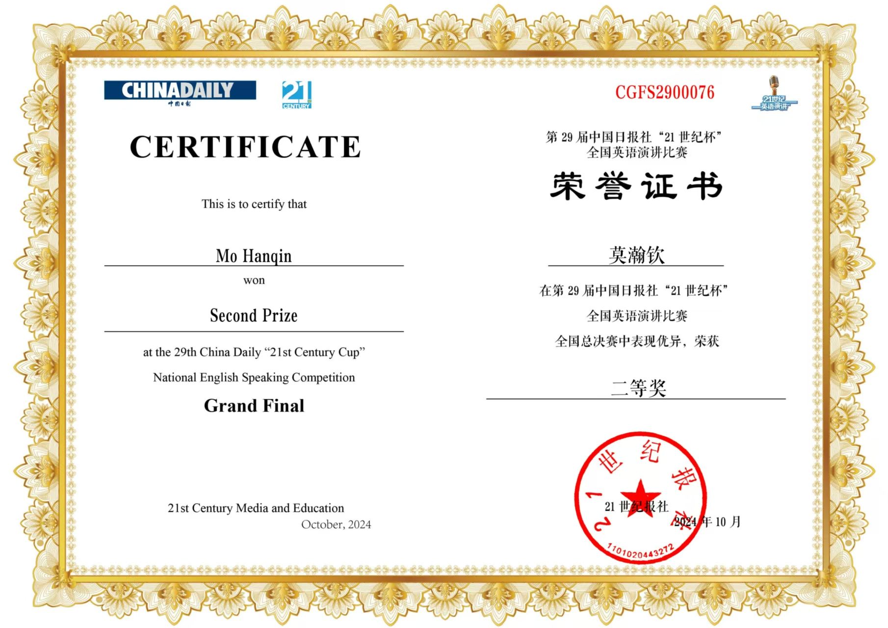 2024年10月17日至10月21日,由中国日报社、21世纪英语教育传媒承办的第29届中国日报社“21世纪杯”全国老员工英语演讲比赛全国赛在江苏无锡落下帷幕。全国总决赛共有来自各个省级赛区的246名选手。在经过5天、三轮的激烈比拼后,beat365英语系2023级英语师范专业莫瀚钦同学获得全国二等奖,beat365英语系丁礼明老师获得优秀指导教师奖。此次获奖也是老员工TOP外语成长训练营的阶段成果。