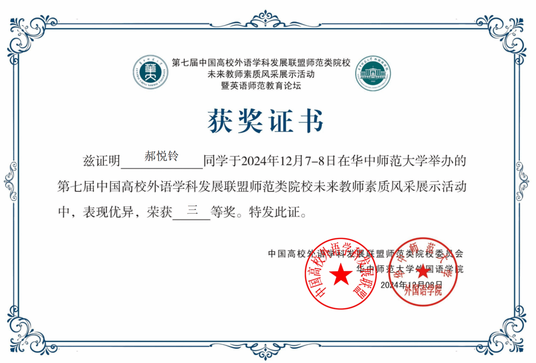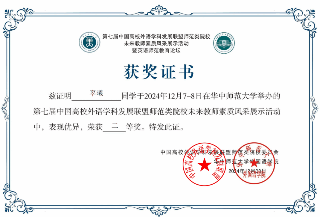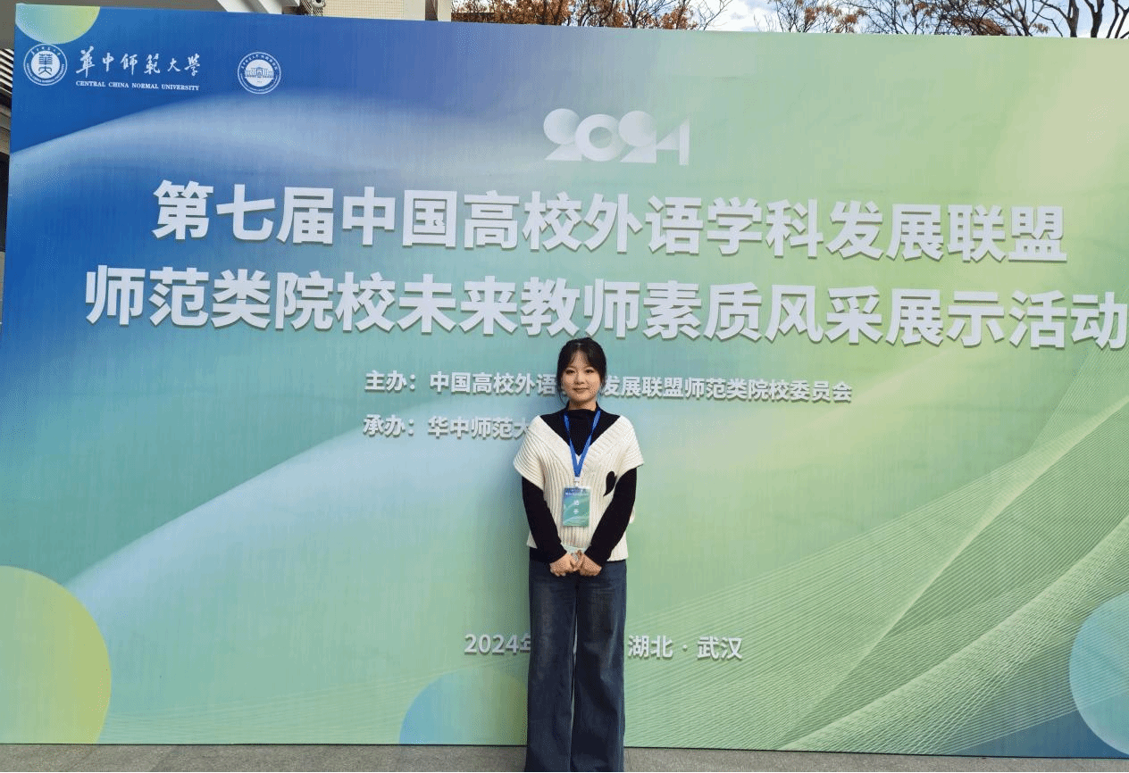 2024年12月7-8日,“第七届中国高校外语学科发展联盟师范类院校未来教师素质风采展示活动”在武汉举行。该活动由中国高校外语学科发展联盟师范类院校委员会主办、华中师范大学承办,来自全国41所院校的80名优秀师范生参加了此次活动。beat365英语系2022级师范生辜曦、郝悦铃两位同学表现优异,分别获得二等奖和三等奖。指导老师杨冬敏、丁礼明荣获优秀指导教师称号。