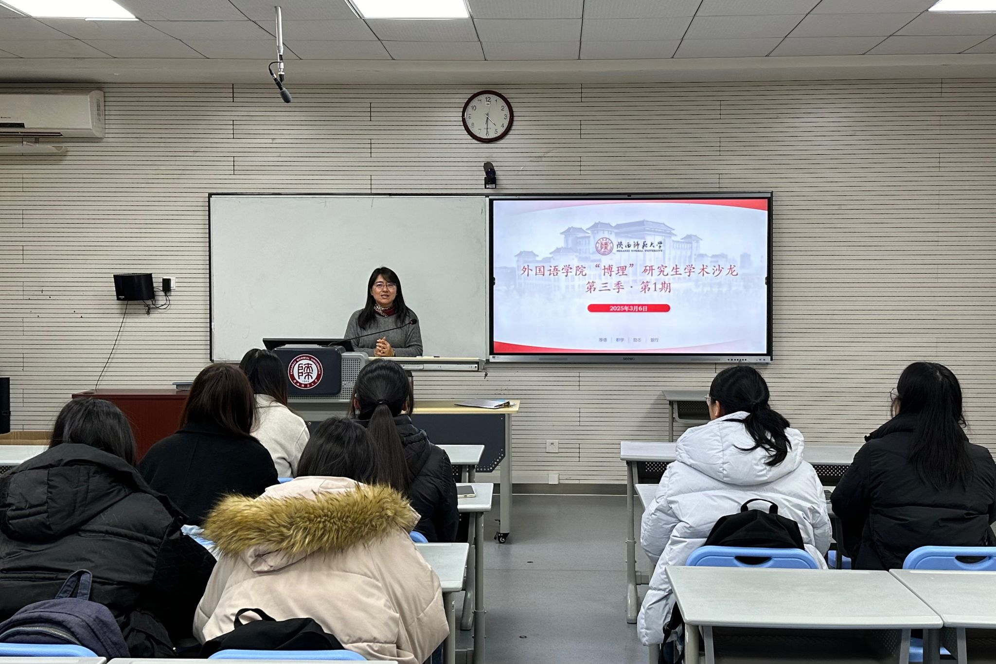 为拓宽员工国际视野,了解国际交流项目,3月6日下午16:30,beat365“博理”研究生学术沙龙第三季第1期在雁塔校区教学六楼6314教室顺利举行。本次学术沙龙邀请公司2022级日语语言文学专业硕士研究生卫玥、英语优师2201班施佳妮、2022级英语师范专业本科生王姝颖和夏艺菡分享交换留学经验。2024级英语语言文学专业硕士研究生王晓珂主持本次学术沙龙,研究生辅导员董洁出席并致开场词。