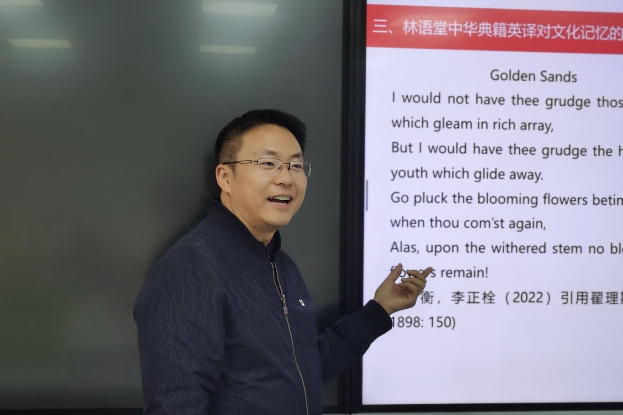 丁礼明博士以《林语堂中华典籍英译中的文化记忆研究》为题进行汇报。他首先从文化翻译和文化记忆的关系出发,通过历史实例阐述了文化认同的波动及其对国家和个人的影响,并进一步分析了文化翻译在文化汇通和文明互鉴中的作用,指明了文化记忆作为人类共同美好记忆的重要性。在此基础上,他又详细介绍了林语堂中华典籍英译文本的文化翻译特点以及其中的文化记忆建构,呈现了从文本建构到思想建构的五个层次框架。最后,丁礼明博士针对林语堂及其他学者对唐代诗歌《金缕衣》的不同译本,从选词、押韵和意境三个层面对比分析不同译本之间的差异,深入探讨了其背后的文化意义,生动展示了翻译过程中语言和文化的复杂交织以及翻译者个人理解和文化背景对翻译结果的影响,凸显了林语堂先生以文会友、以文化人、会通中外、传承经典、铸就传奇的无限魅力。