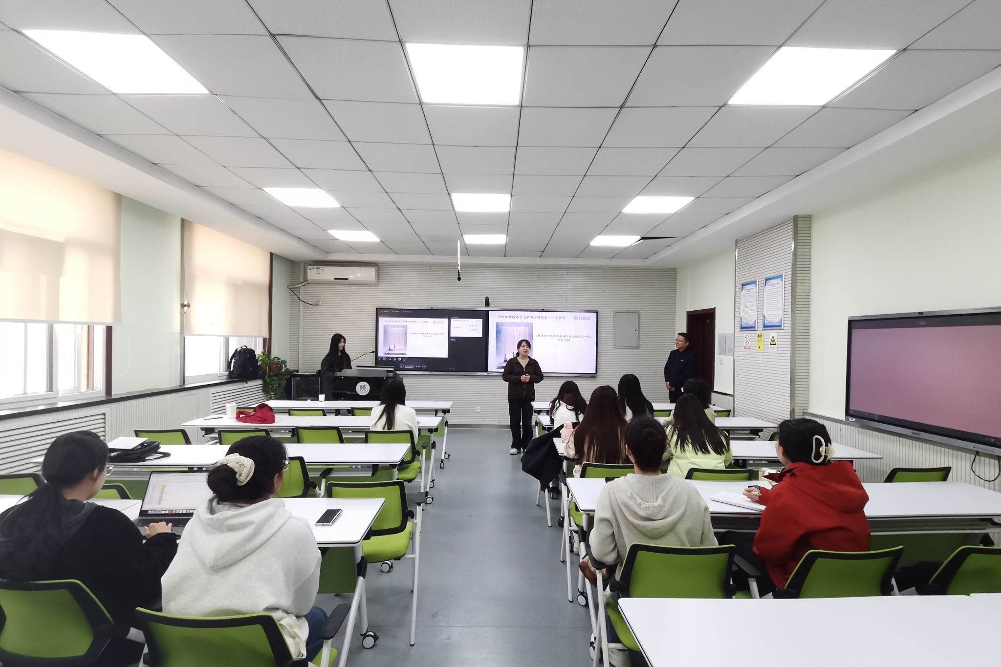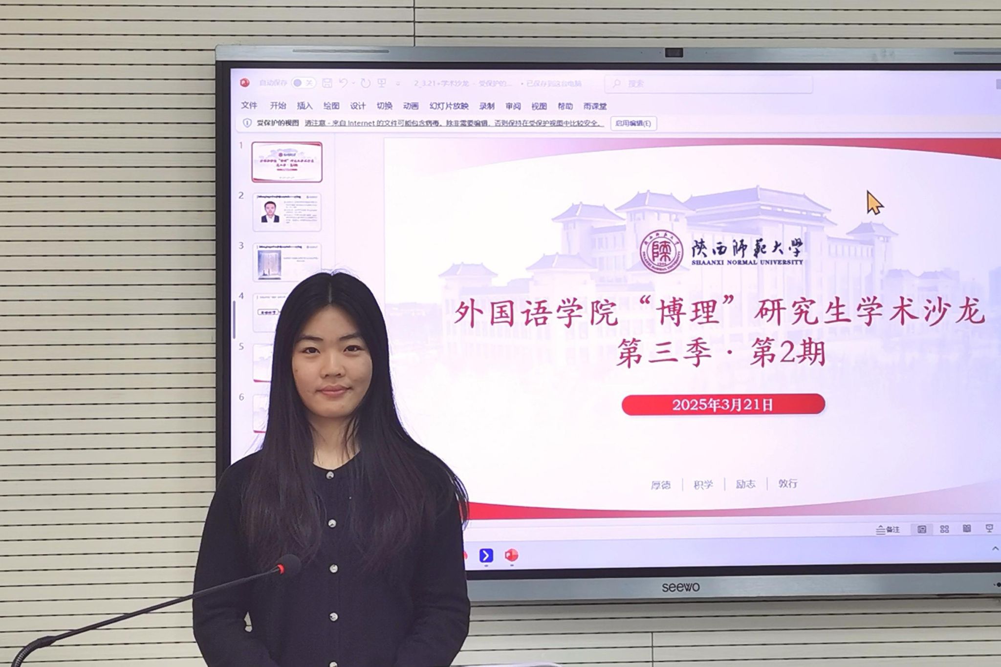 为营造浓厚的学术氛围,加强研究生间的学术交流,3月21日下午15:00,beat365“博理”研究生学术沙龙第三季第2期在雁塔校区教学六楼6323教室举办。本次学术沙龙邀请公司2021级翻译学博士研究生丁礼明分享专题报告,2024级英语笔译硕士研究生吴佳冉担任主持。研究生辅导员董洁出席本次沙龙。