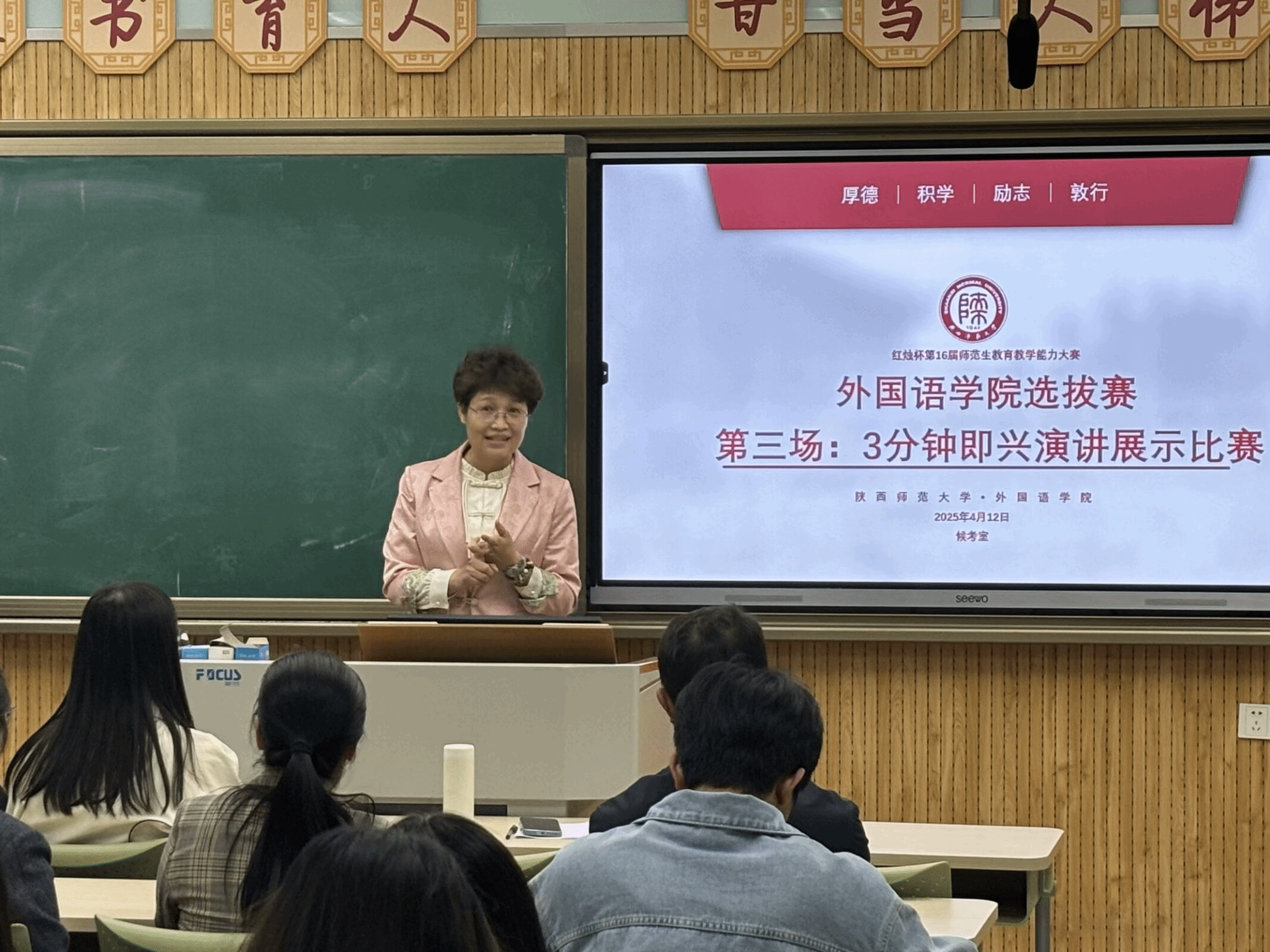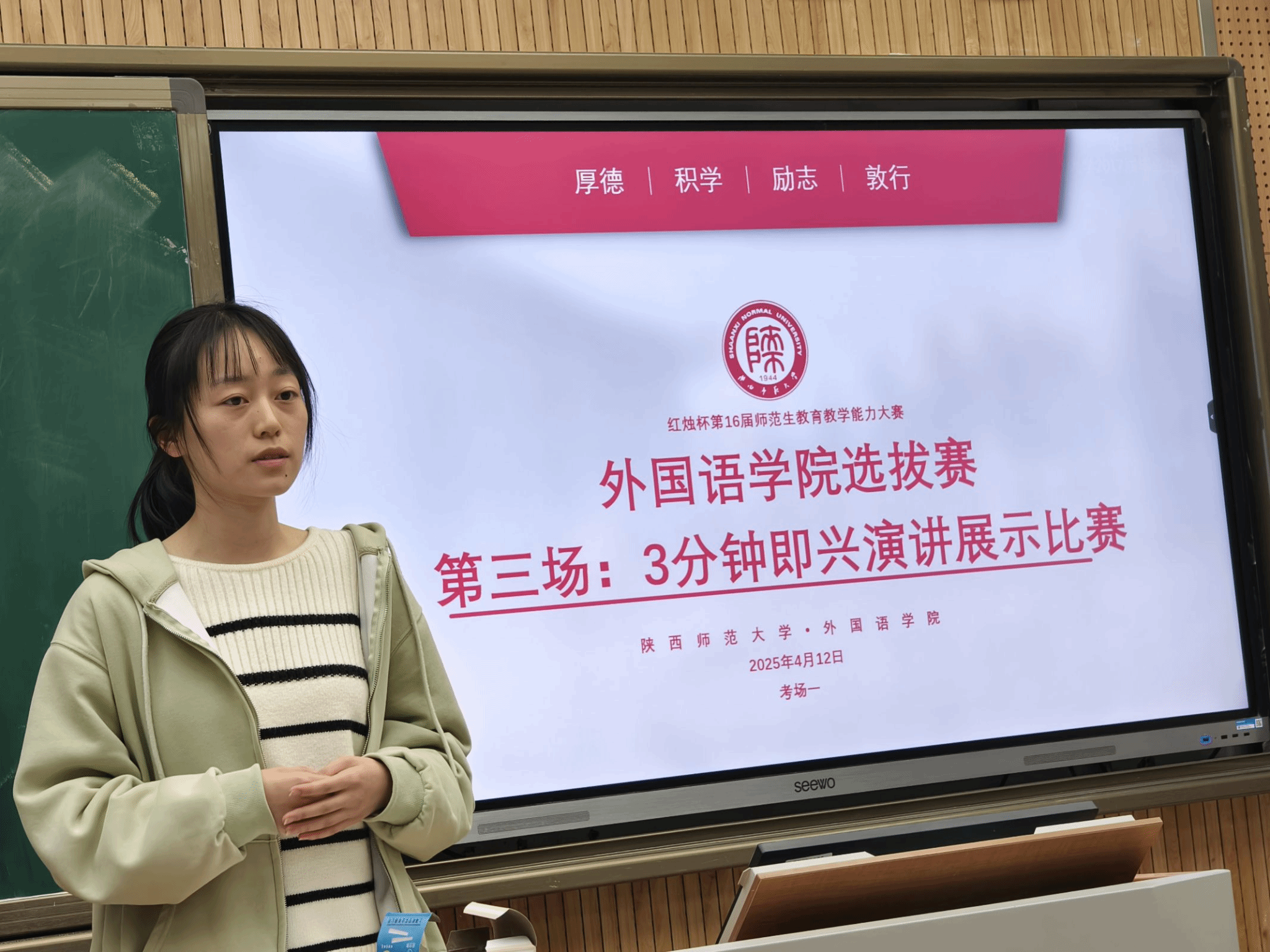4月12日的3分钟即兴演讲内容包含教育、语言、社会和心理等跨学科知识,对新时代师范生的核心素养,尤其是思维能力进行了深层次的考查。