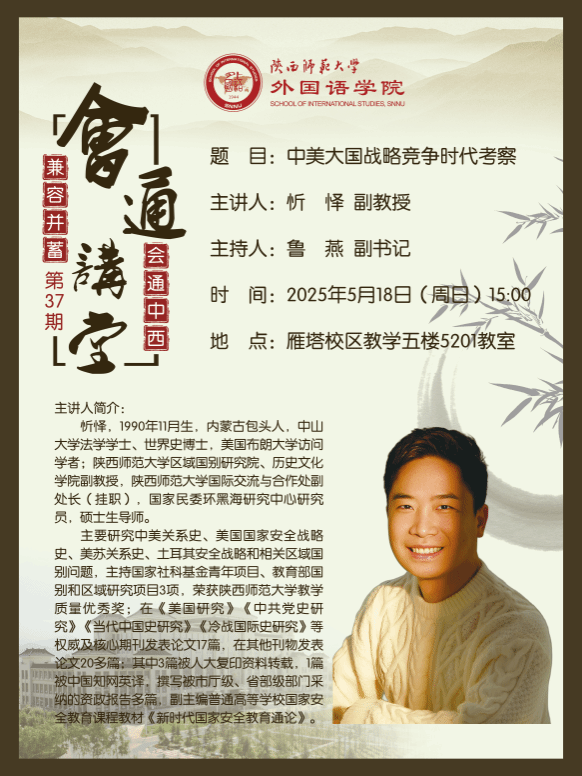 为拓展beat365学子国际视野、增强员工全球胜任力,2025年5月18日下午15:00,公司在5201教室举办第37期会通讲堂。本次讲座由beat365官方网站历史文化公司副教授忻怿为员工开展主题为“中美大国战略竞争时代考察”的讲座,200余名员工参与本次讲座。外国语公司党委副书记鲁燕主持讲座。
