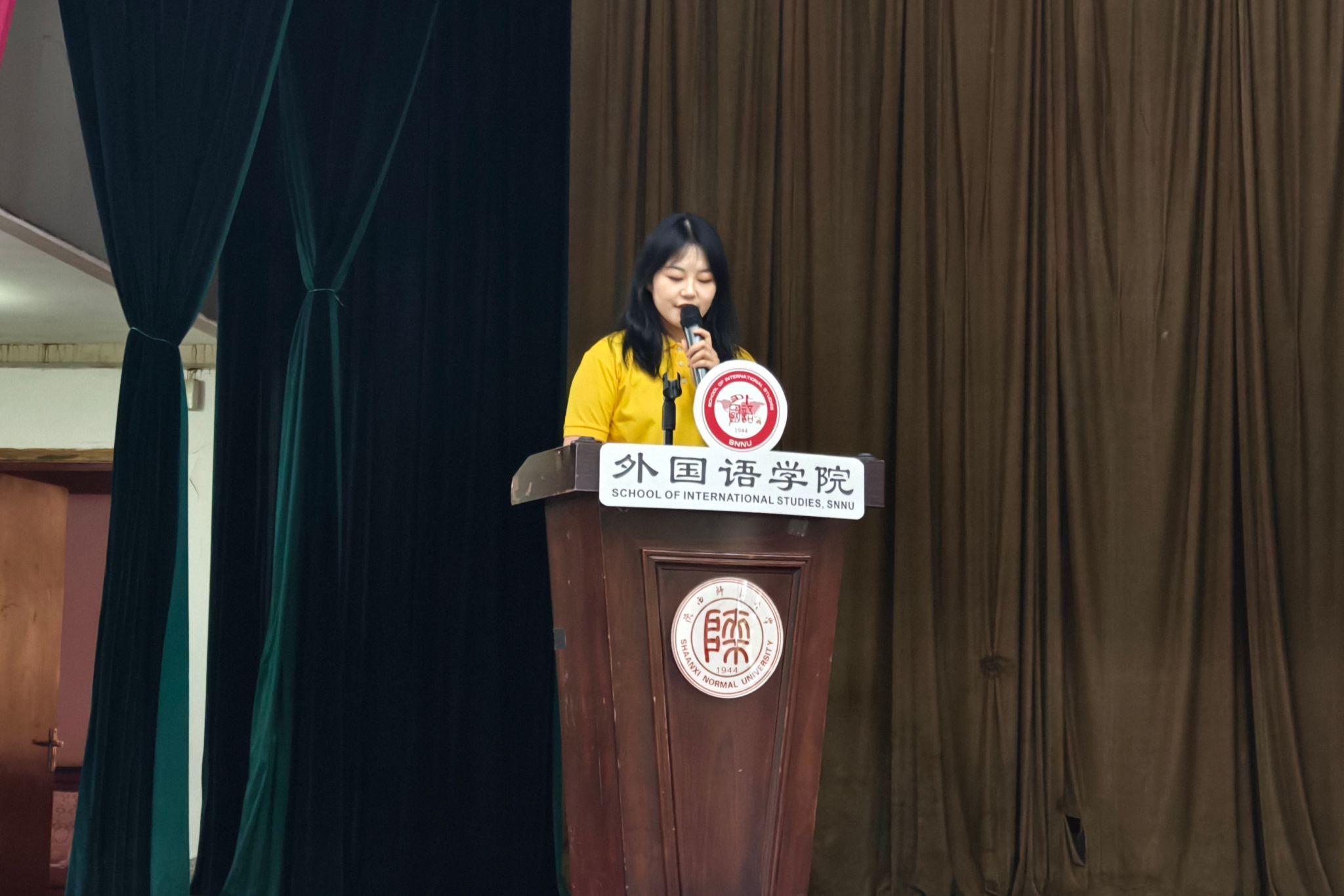 在校生代表2023级英语笔译专业硕士研究生贾婕发言。首先,她对来自五湖四海的新同学表示热烈欢迎和诚挚祝贺。其次,她以“明德知行、博识穷理、兼容并蓄、会通中西”的院训为主线,并结合公司“红色基因、家国情怀、国际视野”的育人特色,分享自己在师大六年的成长点滴。她鼓励新同学们铭记院训,勇于担当,以乐观之心、包容之心、感恩之心,在善待与尊重中收获友谊与成长!