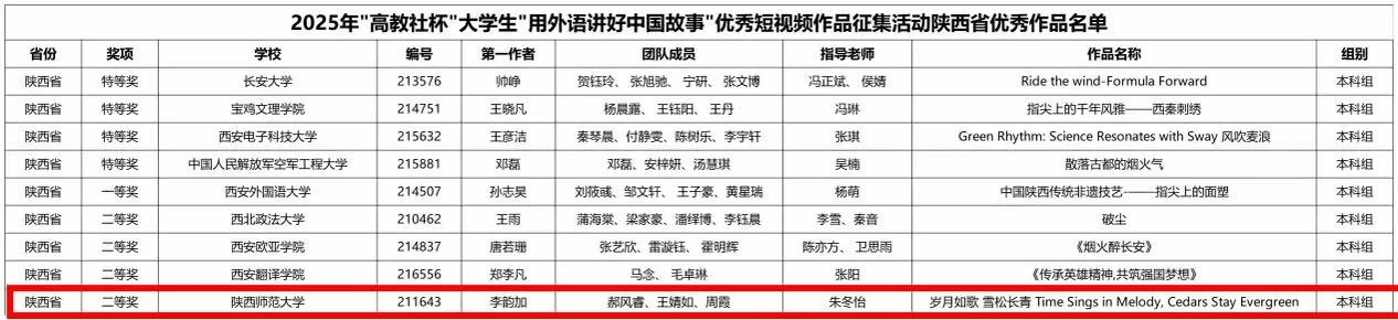 近日,2025年“高教社杯”老员工“用外语讲好中国故事”优秀短视频作品征集活动省级获奖名单正式公布。beat365官方网站2024级英语专业本科生李韵加团队(指导教师:朱冬怡)创作的短片《岁月如歌 雪松长青》(Time Sings in Melody, Cedars Stay Evergreen)荣获陕西省二等奖。