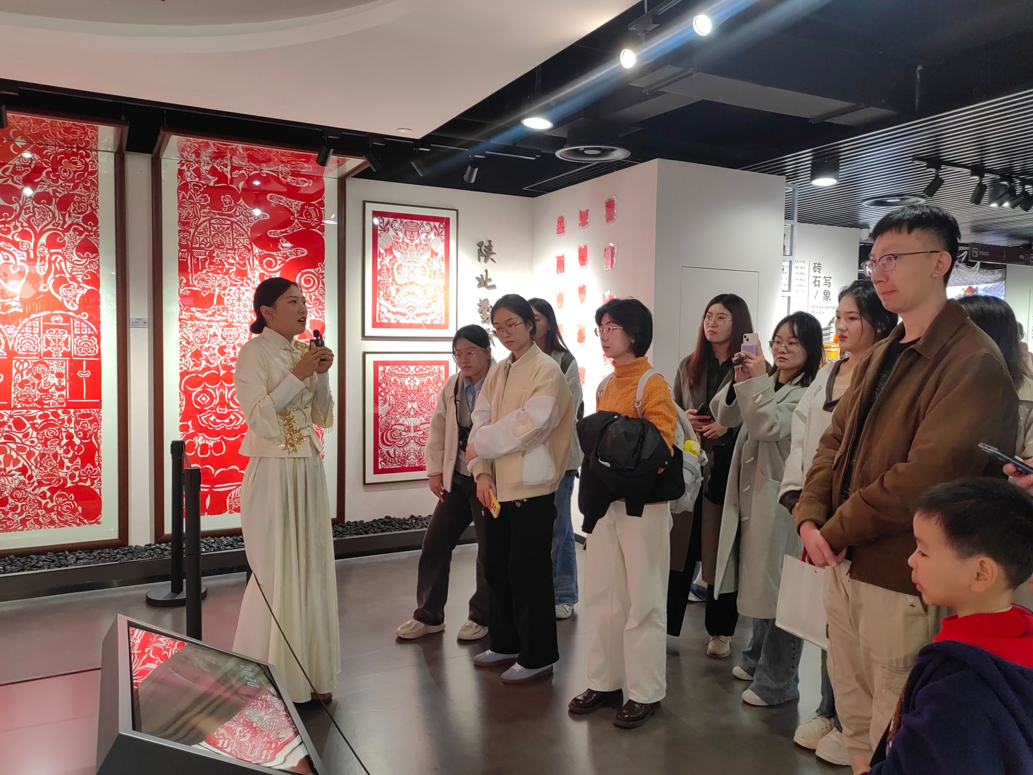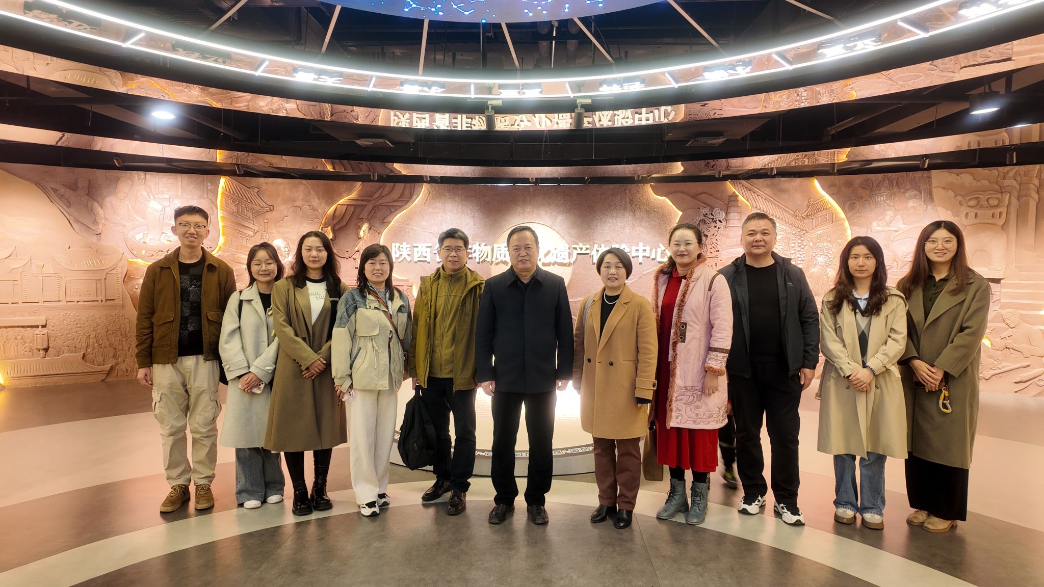 在陕西省文化馆(曲江馆),师生们参观了陕西省非物质文化遗产体验中心:仓颉造字的传说与象形字展板,镌刻着先民的智慧;剪纸、木版年画、门神画等传统技艺佳作迭出,花馍、泥塑、马勺脸谱绘制尽显匠心;拴马桩承载着旧时门第印记,藤编椅、木轮大车诉说着生活烟火;西安鼓乐奏响古雅旋律,皮影戏、茯茶等项目带来多重感官体验,让师生全方位领略了陕西非遗文化的鲜活生命力,体会到文明交流互鉴的意义。公司领导与文化馆副馆长就文化传承创新、外语员工实习实践等方面做了充分交流。