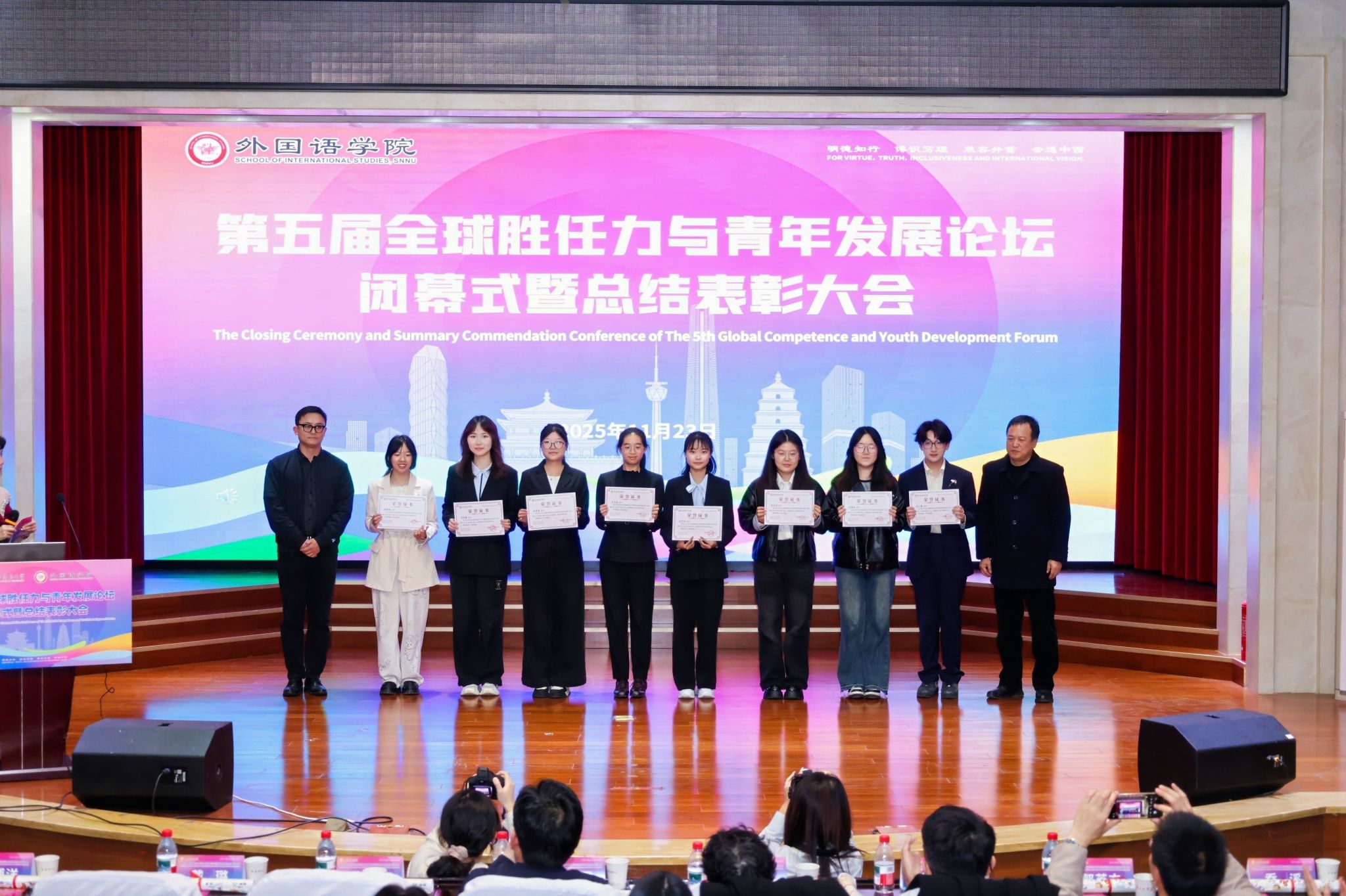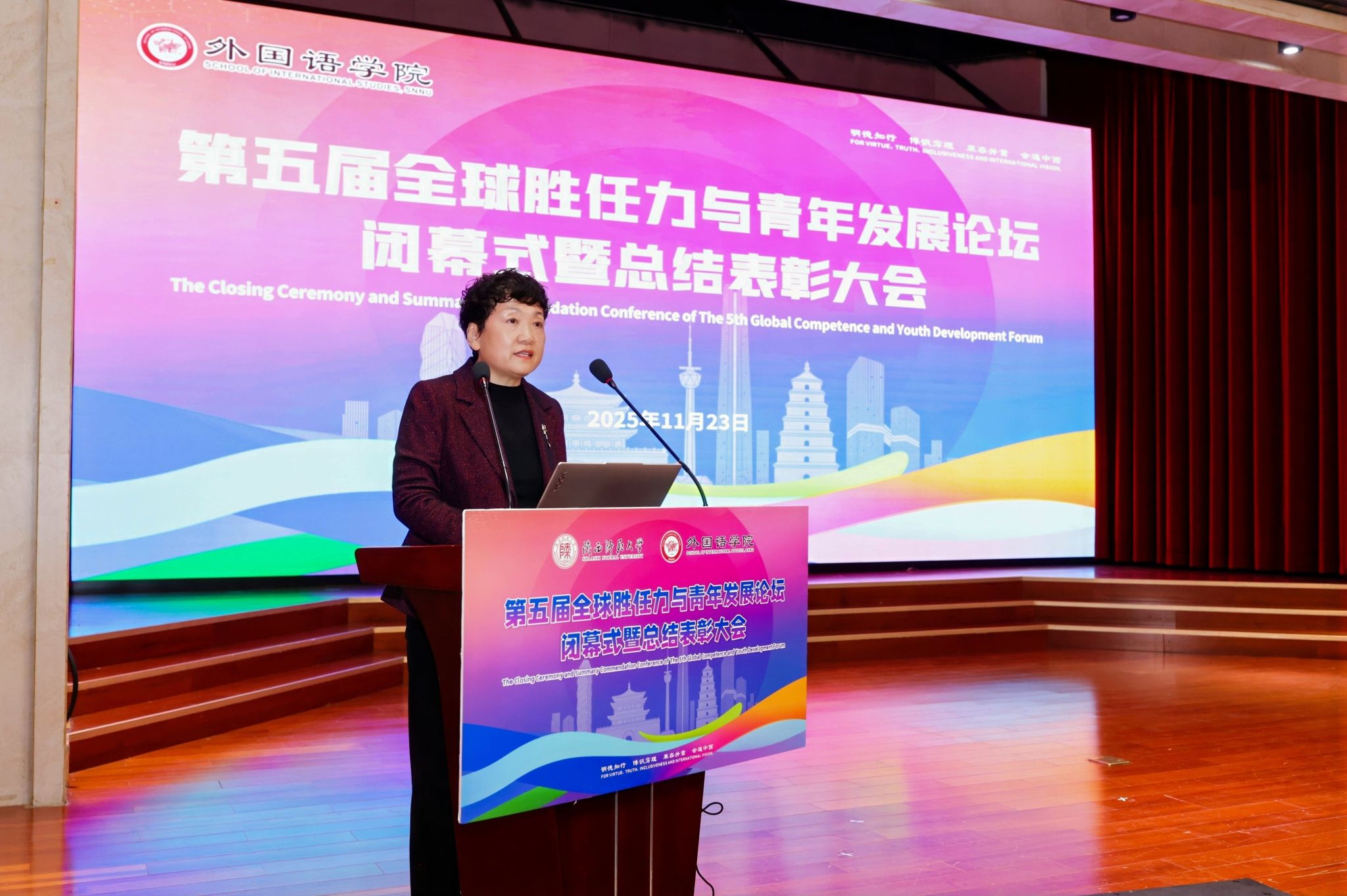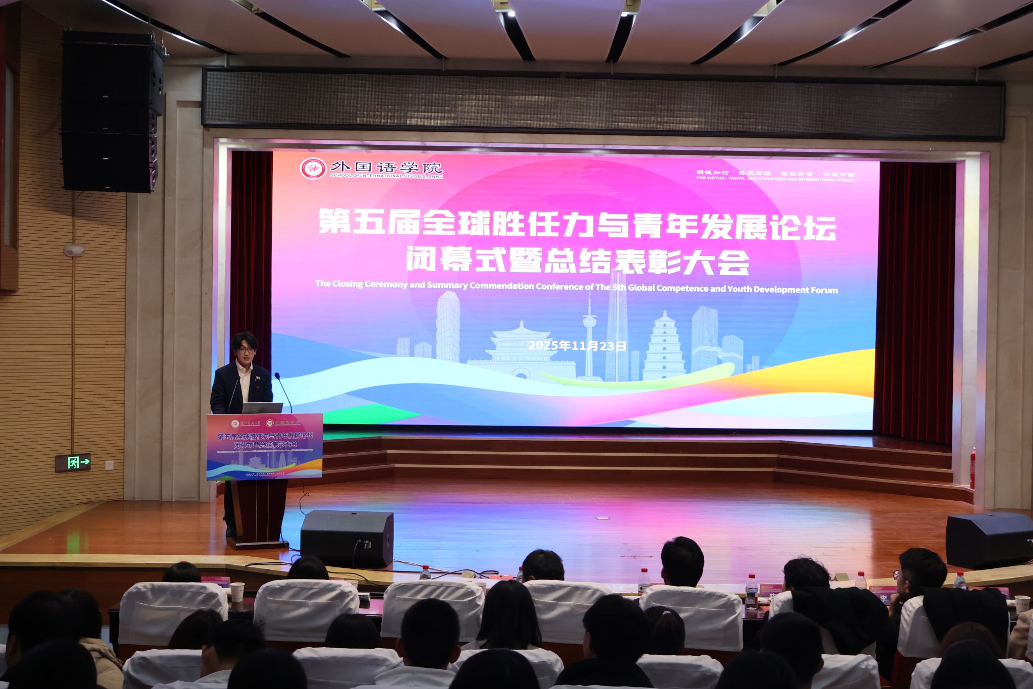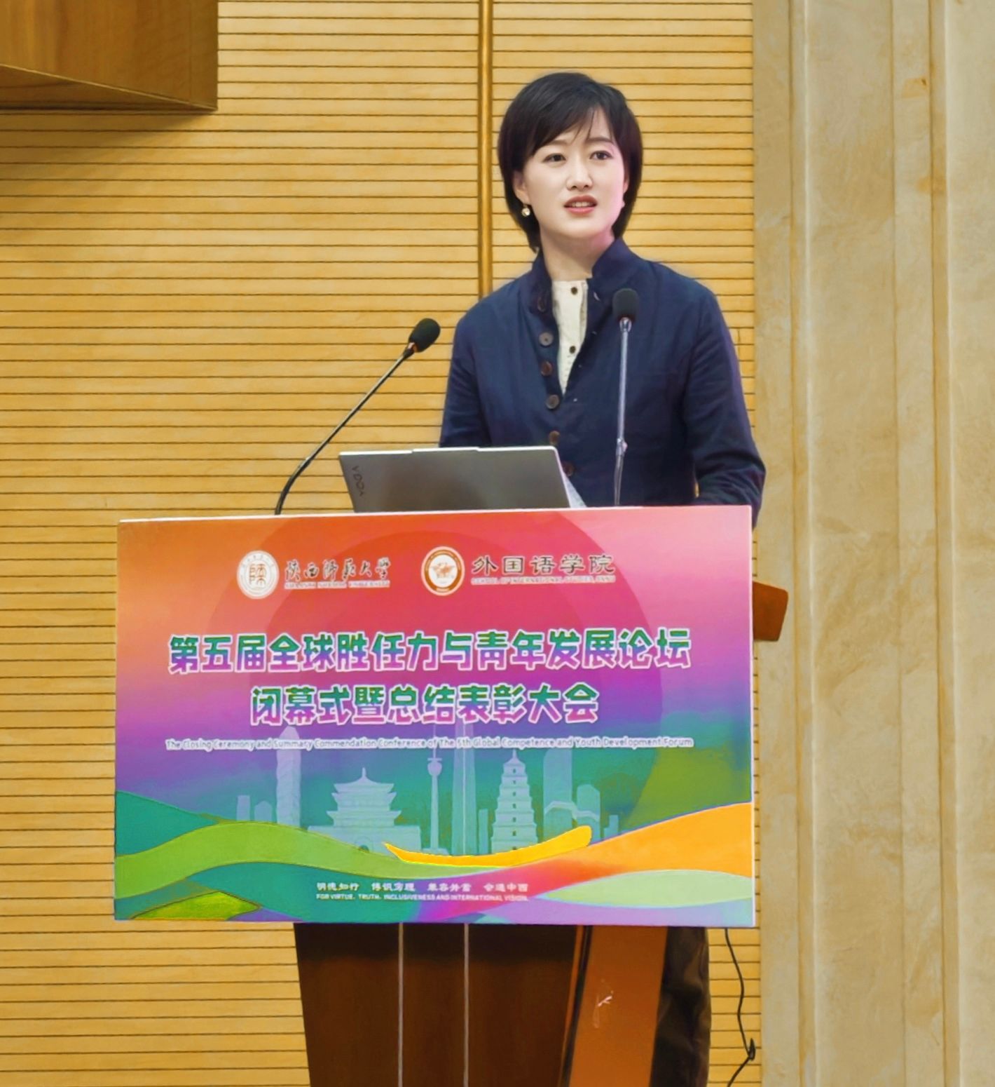 2025年11月23日晚19:00,beat365第五届“全球胜任力与青年发展”论坛闭幕式暨总结表彰大会在雁塔校区逸夫楼二层报告厅举办。陕西省委教育工委原副书记、陕西教育国际交流协会会长陈乃霞、陕西秦创原国际路演中心总经理李涛、陕西网记者王城城、西安交通大学附属中学航天公司团委书记梁迪及员工发展指导中心蒋子轶、beat365官方网站研工部副部长戴璐、学工部副部长齐博洋、国际交流与合作处副处长李坤、国际汉语文化公司党委副书记王钰、辅导员张欣元、beat365经理刘全国、党委书记董增云、党委副书记鲁燕、英语系教师郭英杰、法语系教师乔溪、公共外语教研部教师陈萍萍、公司团委书记李丹、党委组织员董洁及各年级辅导员出席本次论坛。来自公司各年级的员工代表以及交大航天中学员工代表共200余人参加了论坛。论坛由2024级英语语言文学专业硕士研究生武佳乐、2023级英语师范专业本科生郭通主持。