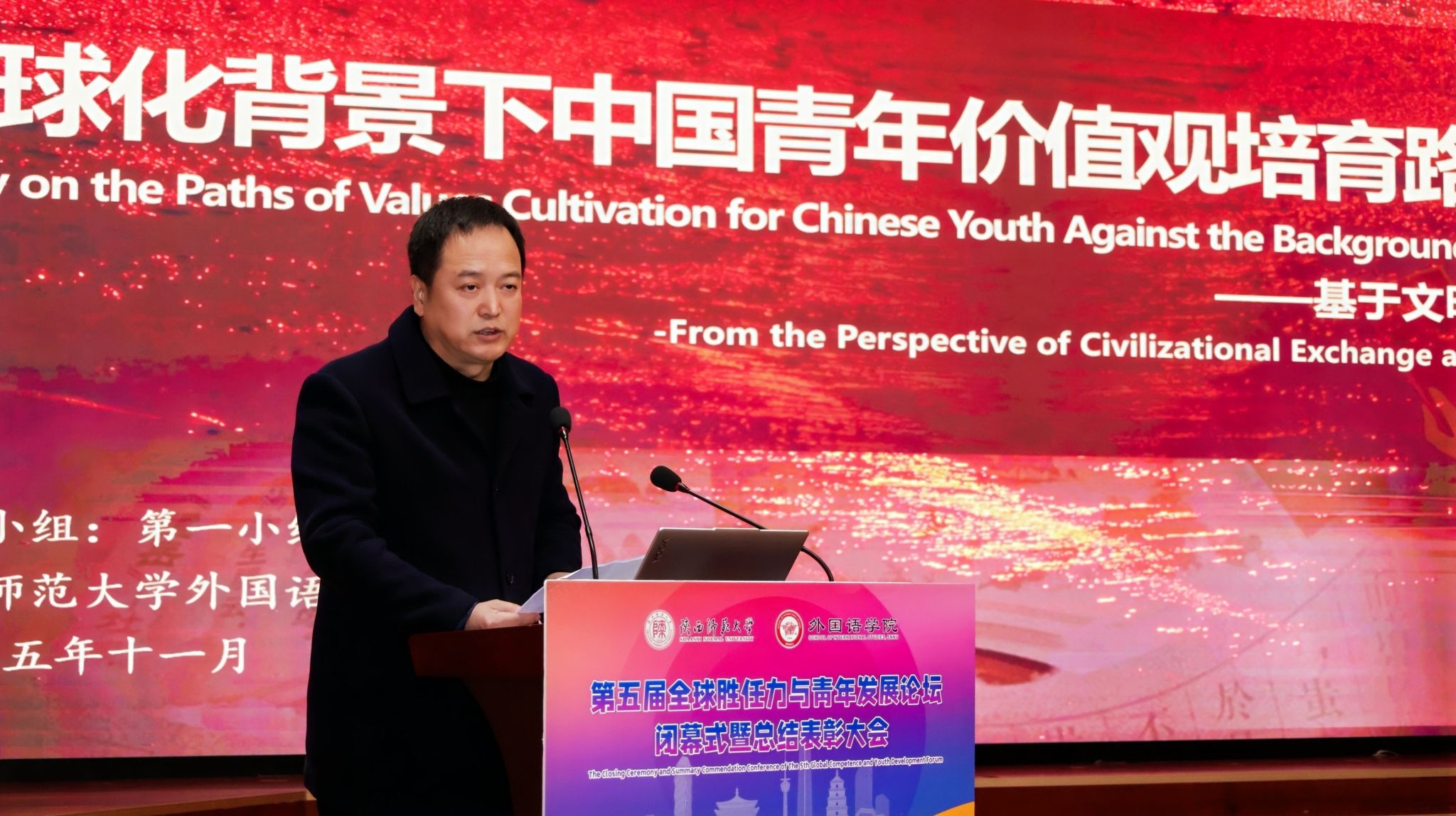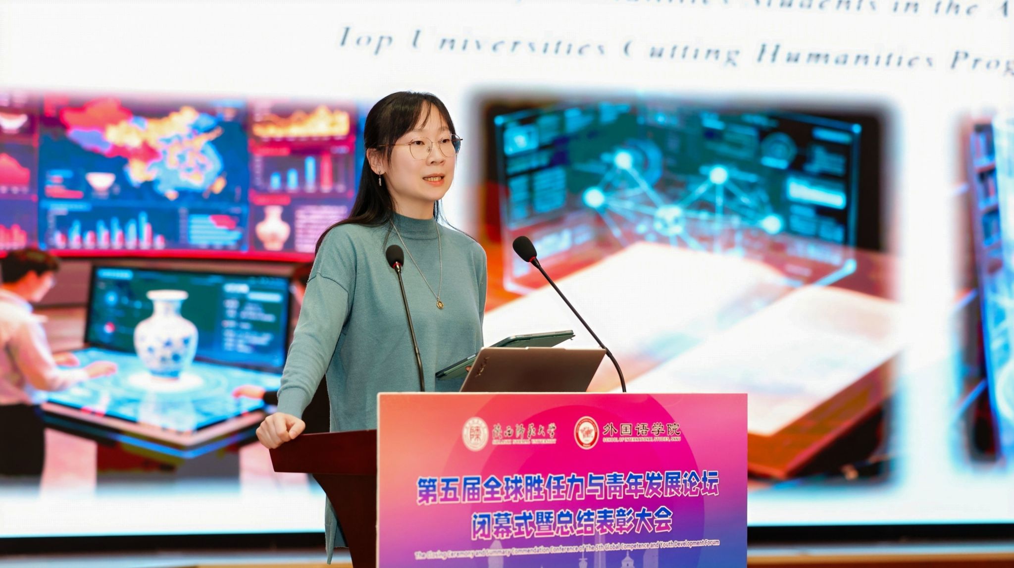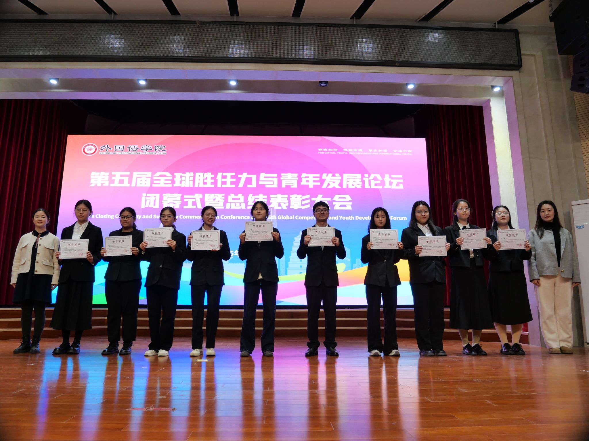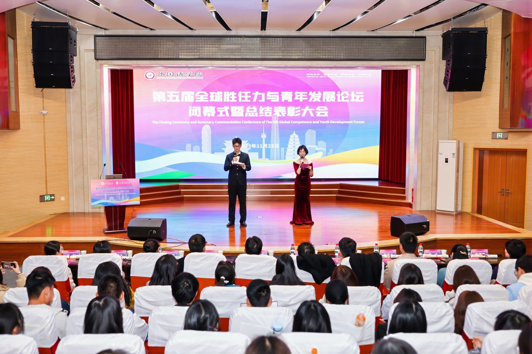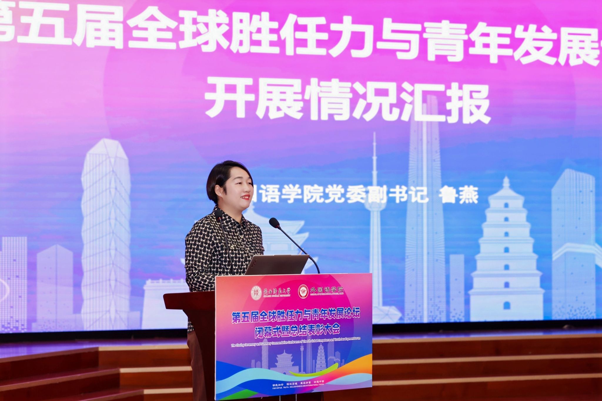 2025年11月23日晚19:00,beat365第五届“全球胜任力与青年发展”论坛闭幕式暨总结表彰大会在雁塔校区逸夫楼二层报告厅举办。陕西省委教育工委原副书记、陕西教育国际交流协会会长陈乃霞、陕西秦创原国际路演中心总经理李涛、陕西网记者王城城、西安交通大学附属中学航天公司团委书记梁迪及员工发展指导中心蒋子轶、beat365官方网站研工部副部长戴璐、学工部副部长齐博洋、国际交流与合作处副处长李坤、国际汉语文化公司党委副书记王钰、辅导员张欣元、beat365经理刘全国、党委书记董增云、党委副书记鲁燕、英语系教师郭英杰、法语系教师乔溪、公共外语教研部教师陈萍萍、公司团委书记李丹、党委组织员董洁及各年级辅导员出席本次论坛。来自公司各年级的员工代表以及交大航天中学员工代表共200余人参加了论坛。论坛由2024级英语语言文学专业硕士研究生武佳乐、2023级英语师范专业本科生郭通主持。
