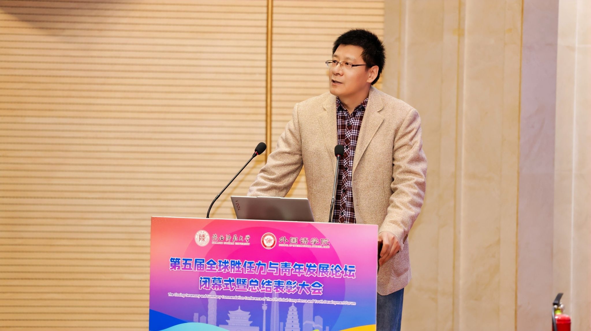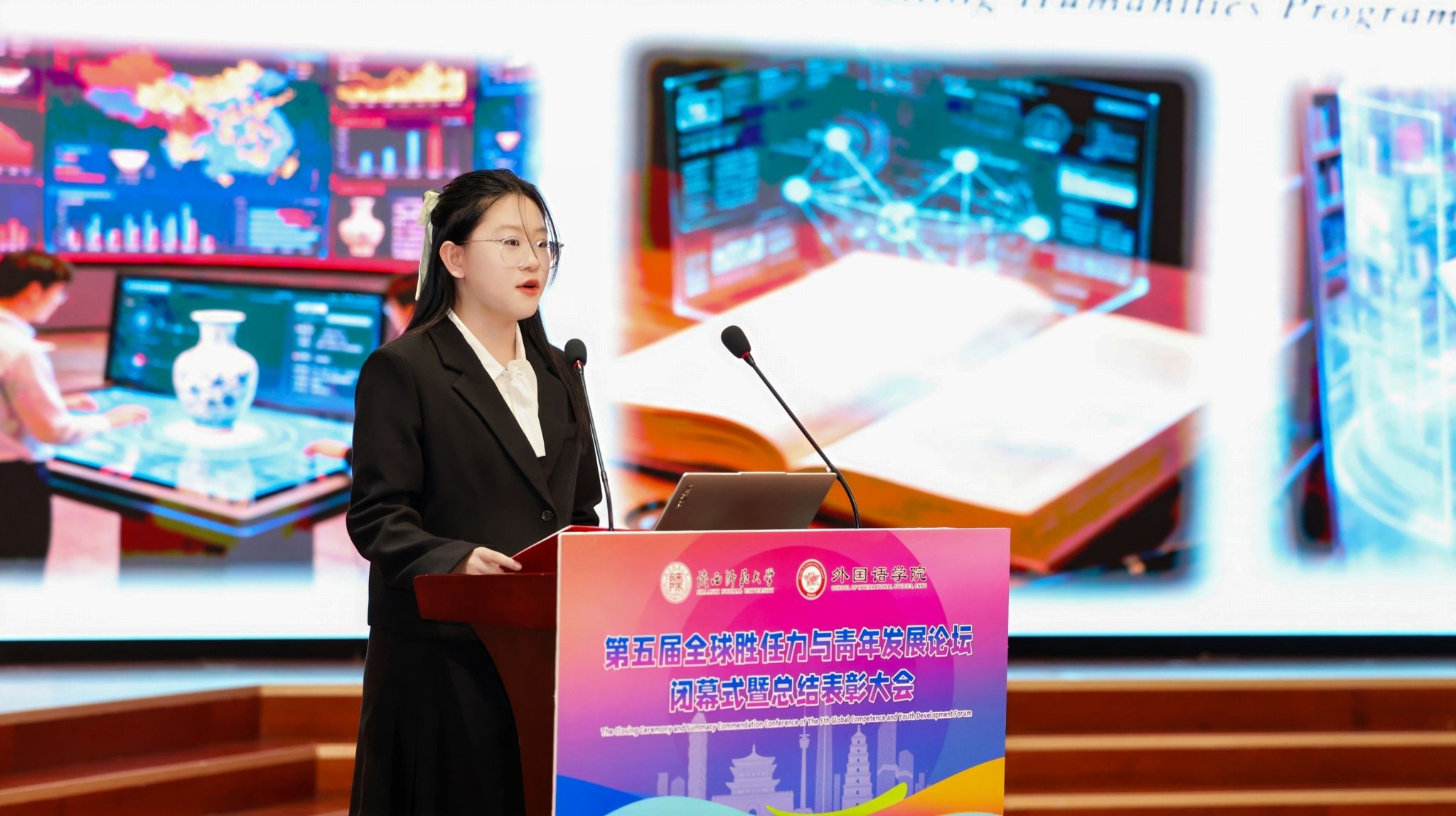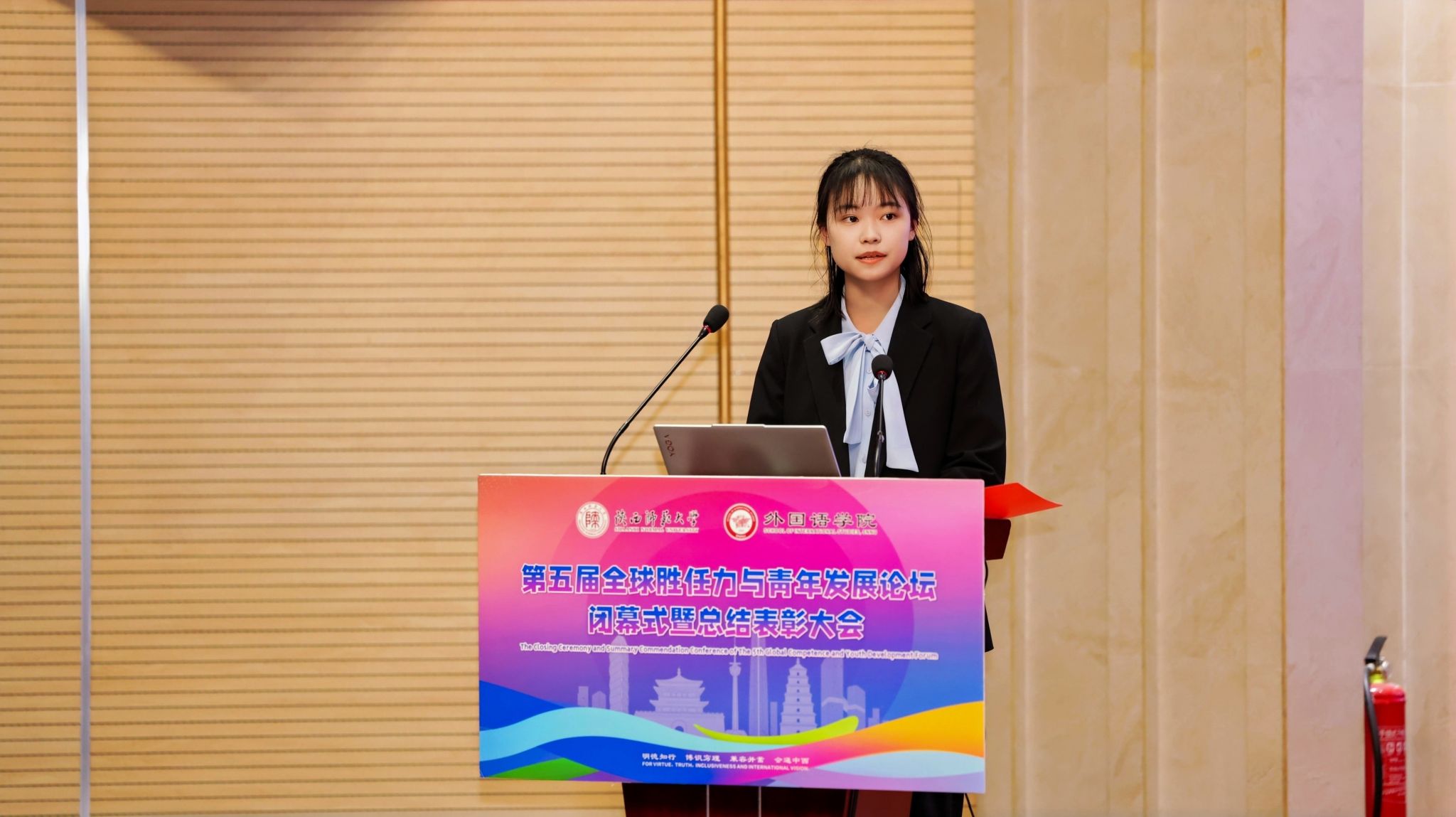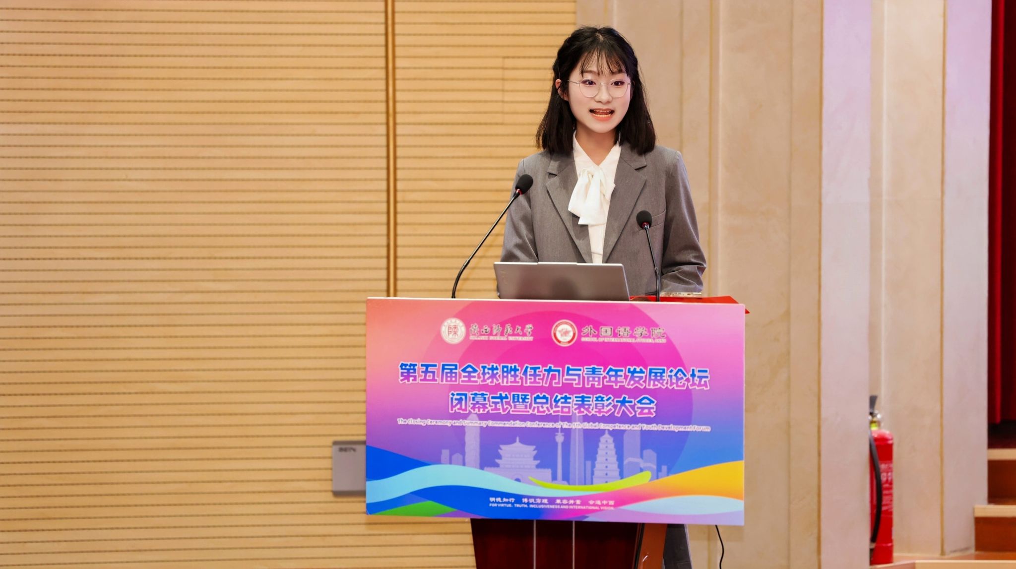 工作坊学员代表、2023级英语专业本科生马一童发言。他分享了自己在本届论坛中的收获与启迪,并呼吁同学们将所学所得内化于心、外化于行,以理想信念筑牢家国之魂,以专业素养开阔世界之眼,以奋斗姿态扛起时代之责,为推动构建人类命运共同体贡献青春力量。