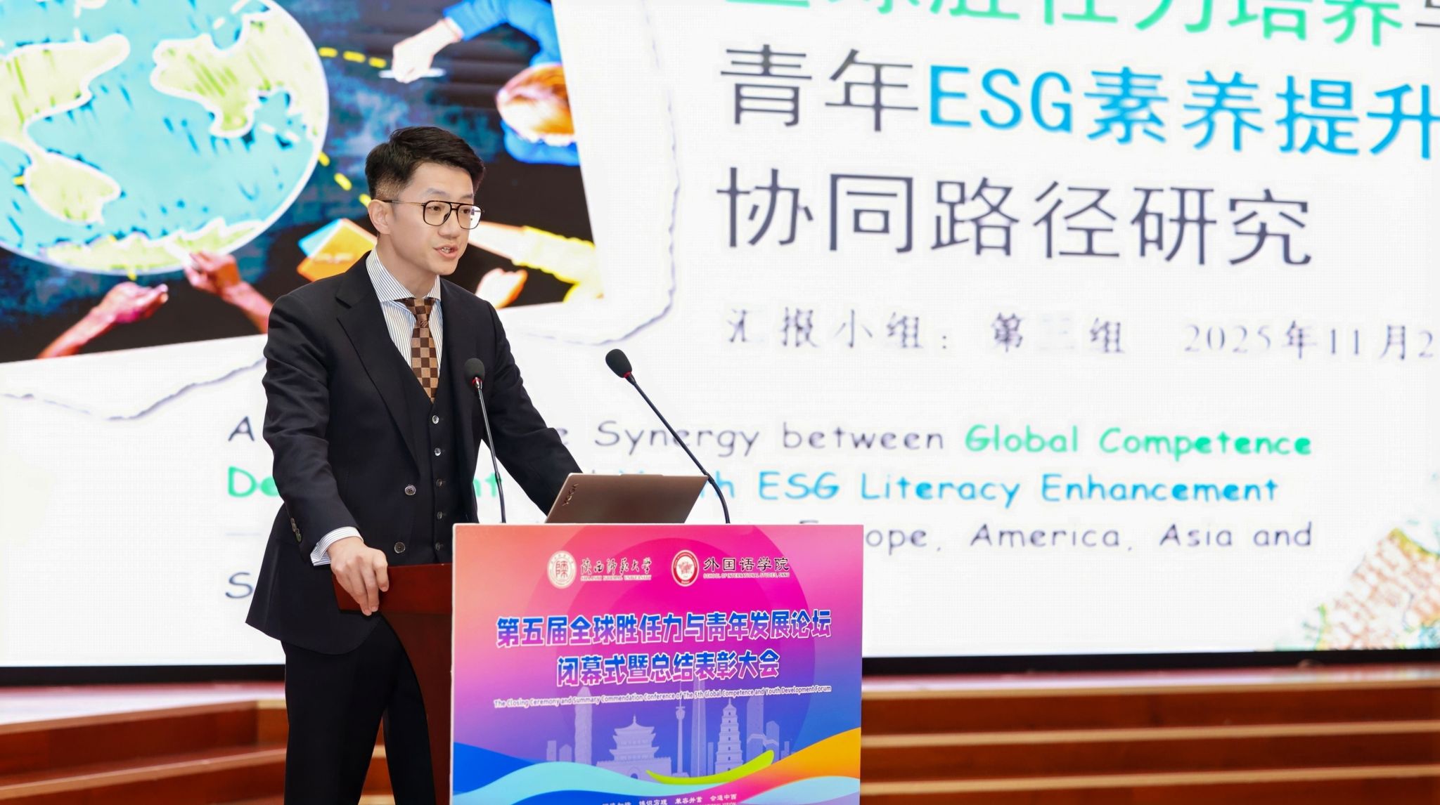2022级英语专业本科生齐文清代表第三小组汇报题为《全球胜任力培养与青年ESG素养提升的协同路径研究》的报告。指导老师李涛点评,协同路径的研究回应了企业的迫切需求,即寻找既懂专业、又具备可持续发展思维的复合型人才,他鼓励同学们培养跨界思考能力,从而在未来发展中占据独特优势。