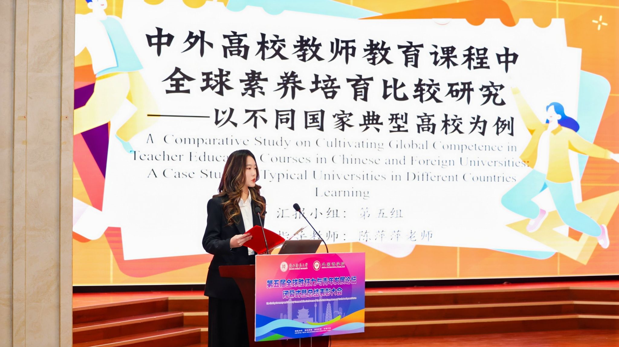 2024级英语专业本科生孟夏伊代表第五小组汇报题为《中外高校教师教育课程中全球素养培育比较研究》的报告。指导老师陈萍萍点评,建议同学们后续研究可以获取实证性数据,将质性研究和量化分析相结合,形成既融通国际视野,又彰显中国立场的教师教育新范式。
