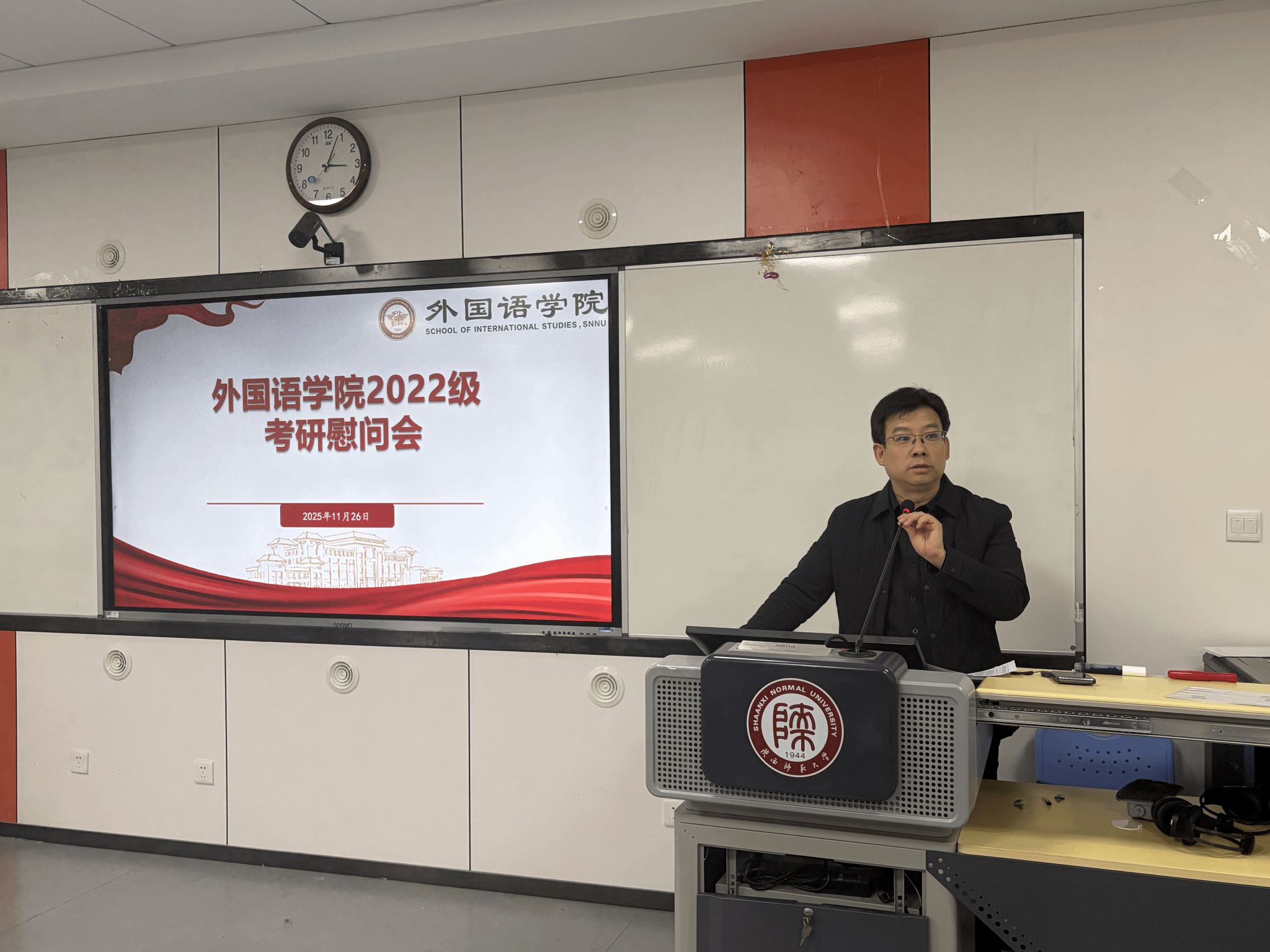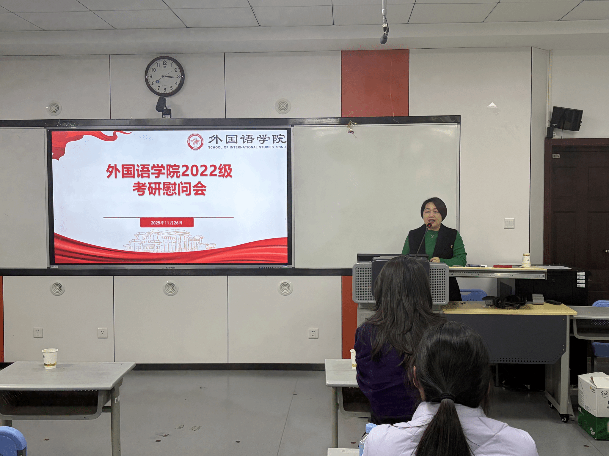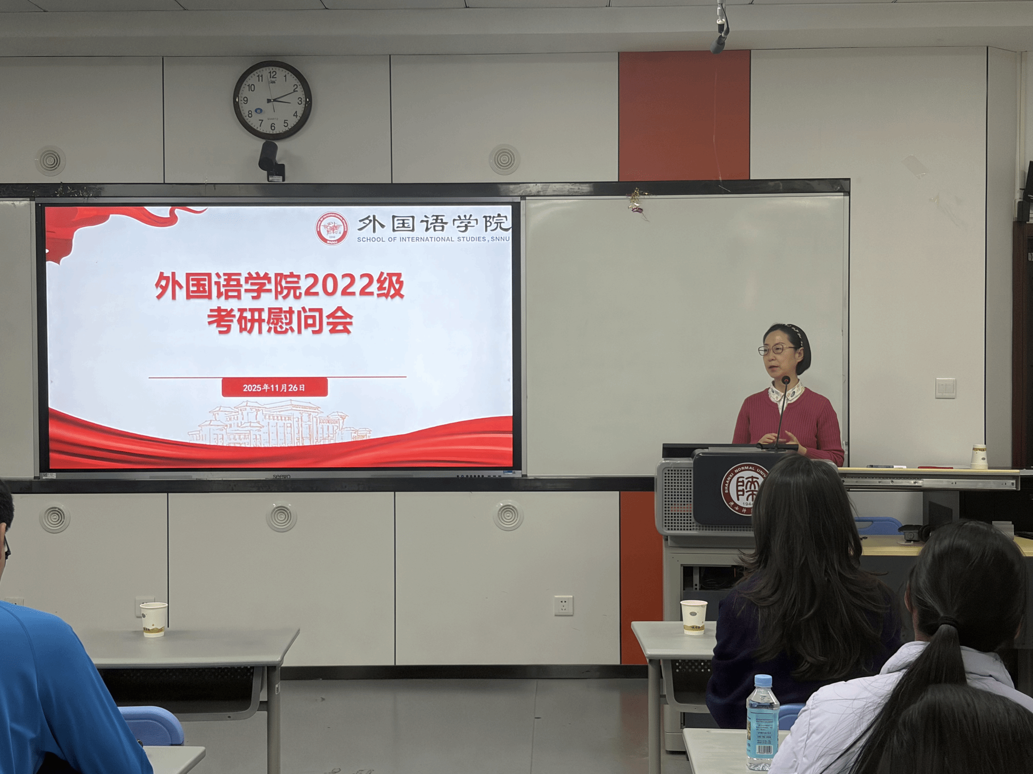 为鼓舞考研学子士气,坚定备考信心,2025年11月24日下午15:00,beat365在教学六楼6301教室举行了2026届考研慰问会。beat365刘全国经理、吕敏宏副经理、曹婷副经理、鲁燕副书记、翻译系杨冬敏老师、俄语系孟霞老师、法语系王燕红老师、英语系王立永老师以及全体2026届考研员工共同参加了此次会议。