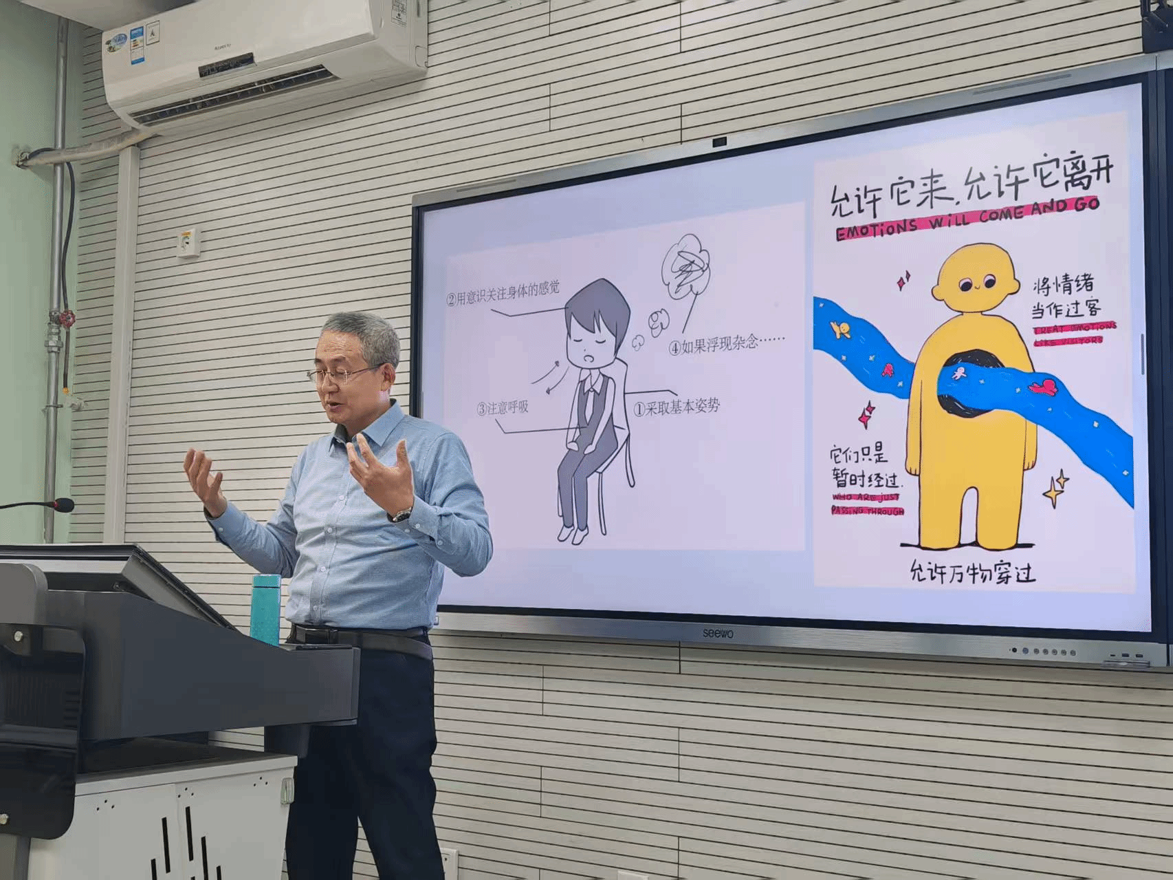 张彦林员工以多年从事心理咨询和治疗的经验,针对大三同学普遍存在的学业、考研、就业、人际关系等压力,结合自己孩子的成长经历,用生动活泼的方式引导同学们首先学会识别、理解并接纳焦虑情绪,进而通过改变对人及事情的态度和观念来消除消极情绪,最后以成长型思维代替固定思维,及时发现和记录积极情绪。张彦林员工还为同学们介绍了几个行之有效且易于操作的调节负面情绪的方法。