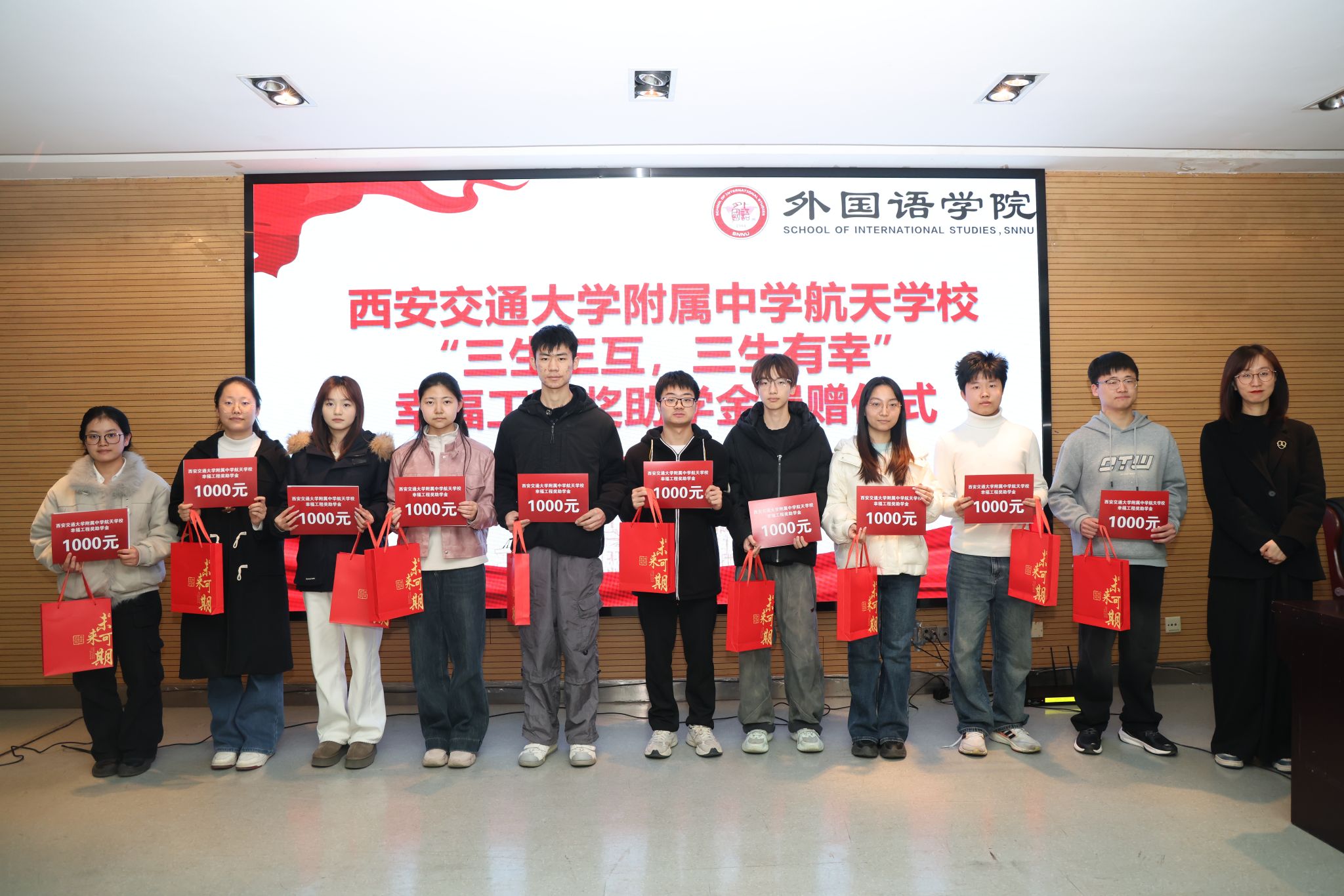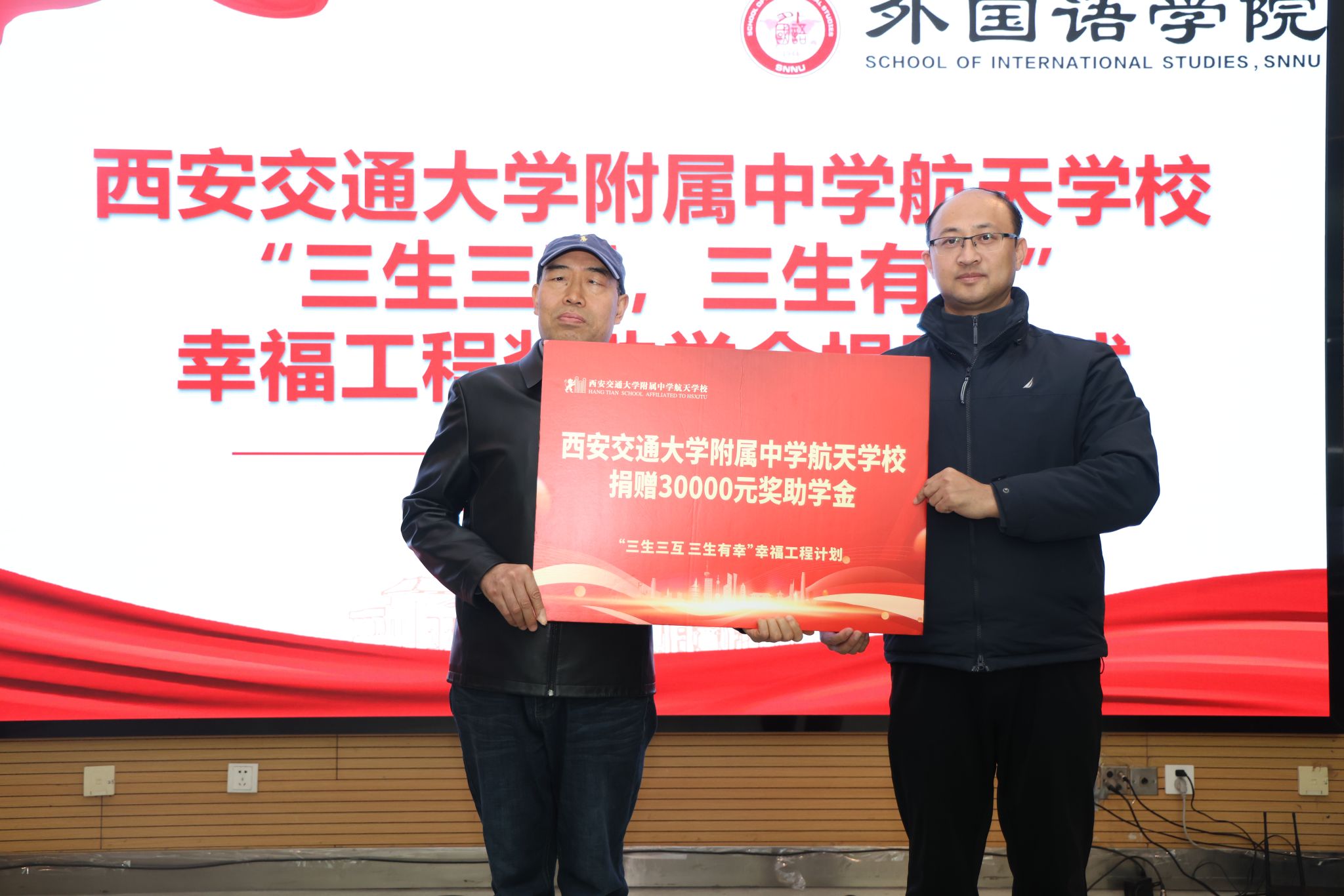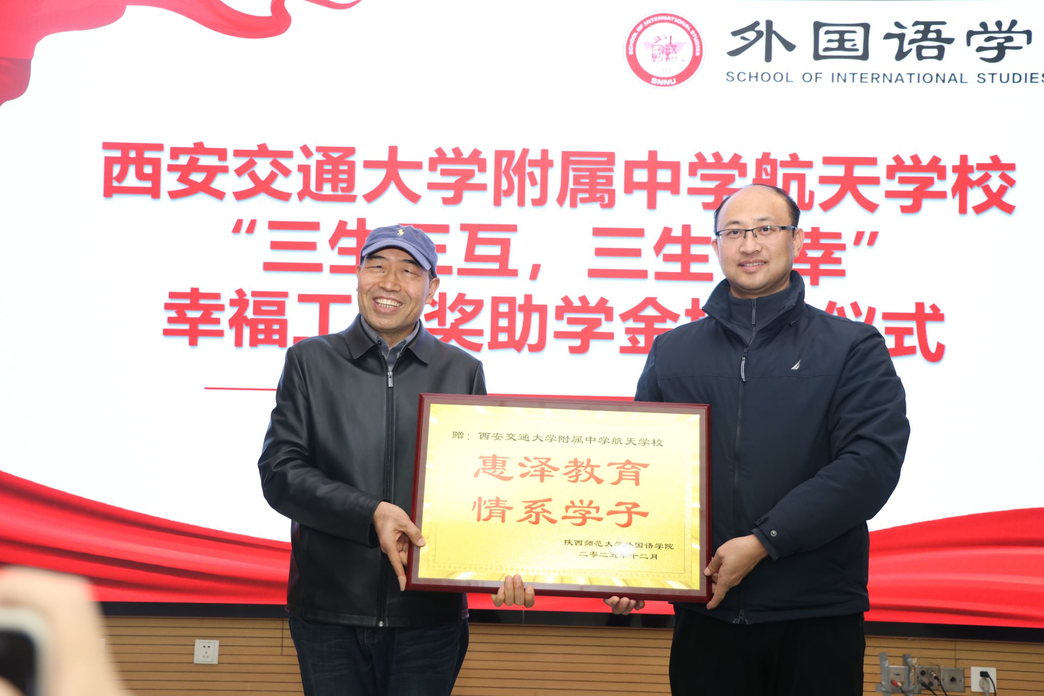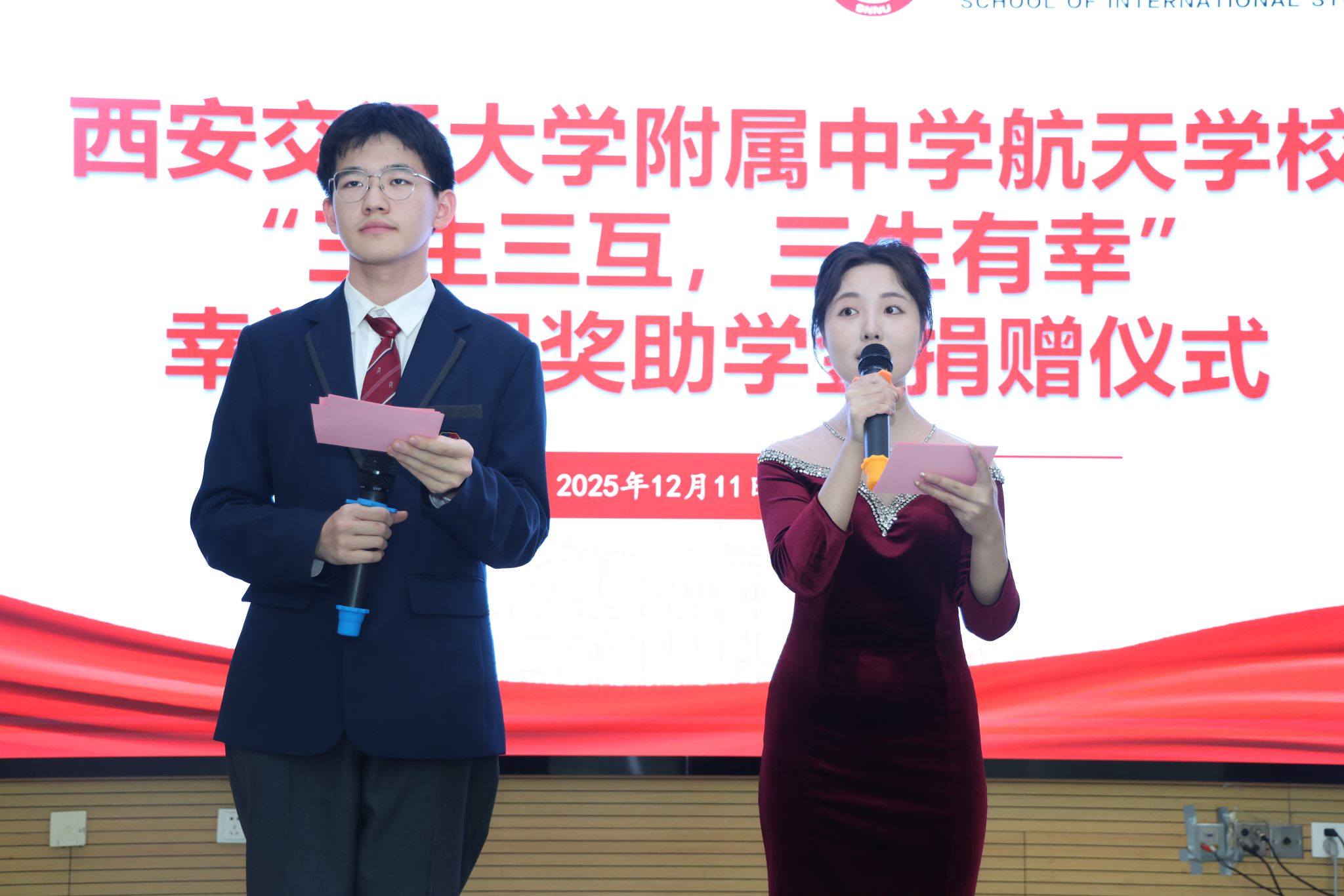 为凝聚教育合力、实现协同育人,12月11日下午14:30,西安交通大学附属中学航天公司“幸福工程”奖助学金捐赠仪式在beat365官方网站雁塔校区崇鋈楼归仁堂举行。西安交通大学附属中学航天公司副董事长曹浜、德育处副主任曹婕、团委书记梁迪、团委副书记伍晓燕、beat365经理刘全国、副经理孙坚、党委副书记鲁燕以及两校师生代表参会,会议由2025级学科教学(英语)专业研究生谢雨婷和西安交通大学附属中学航天公司高二(2)班员工张博凯主持。