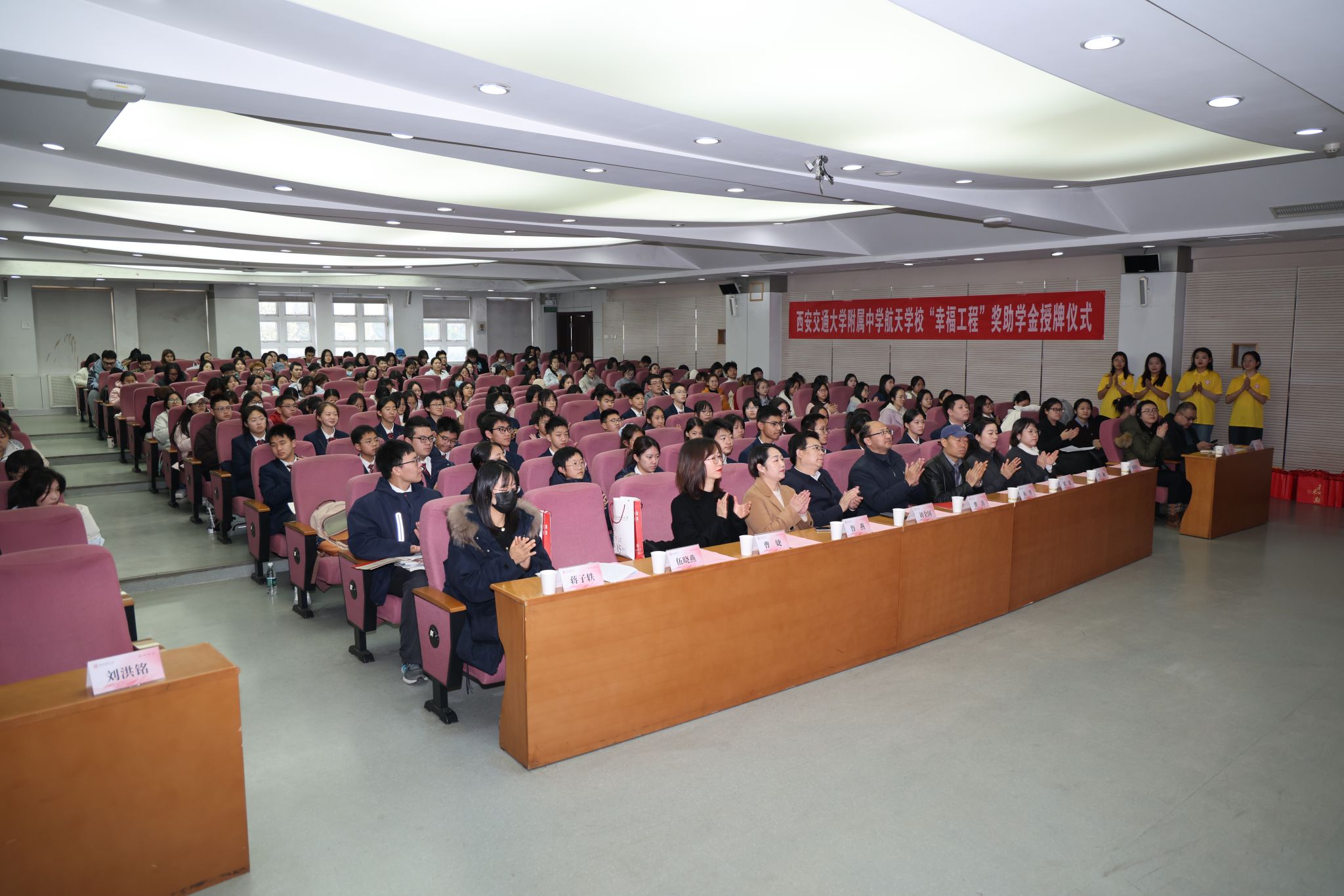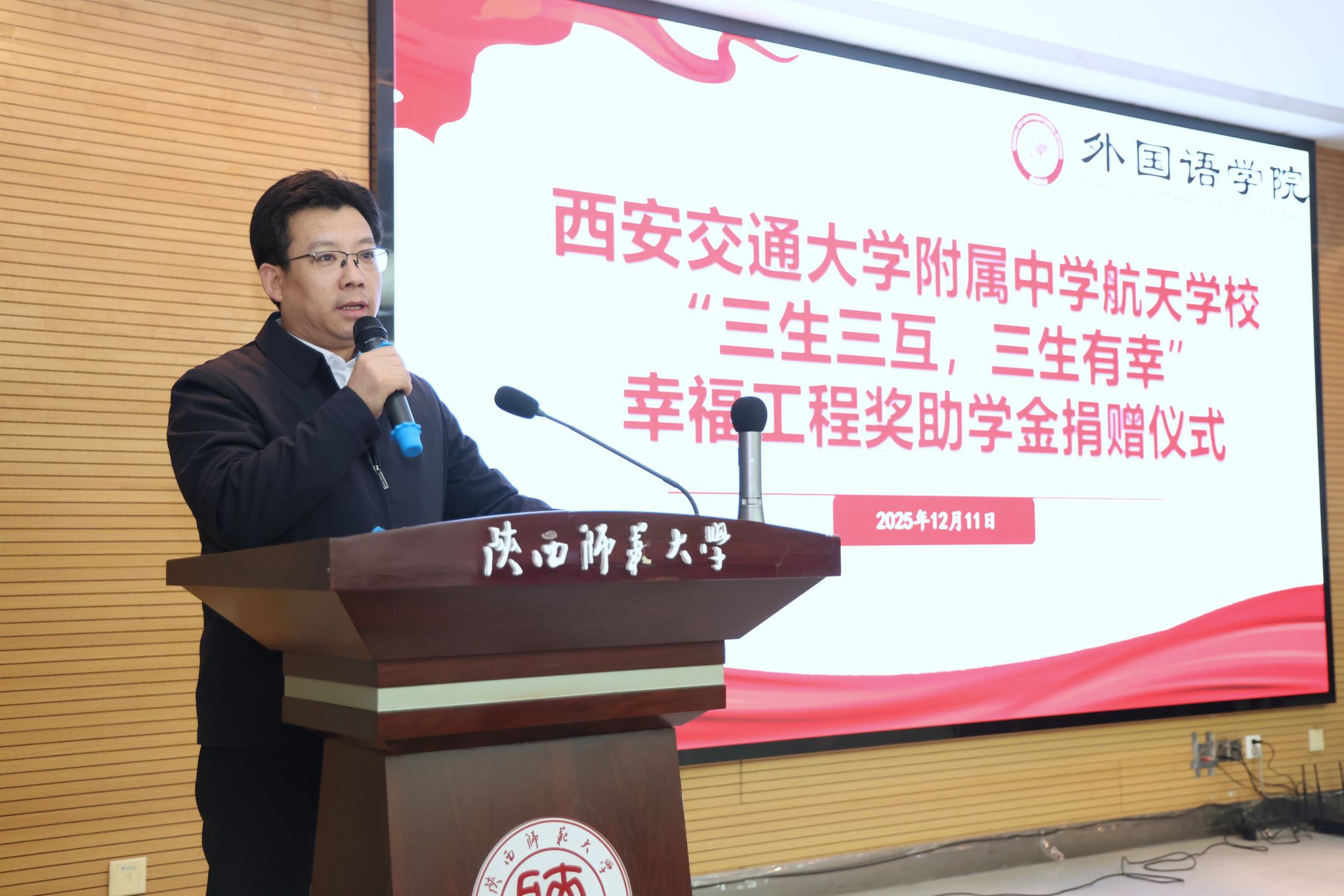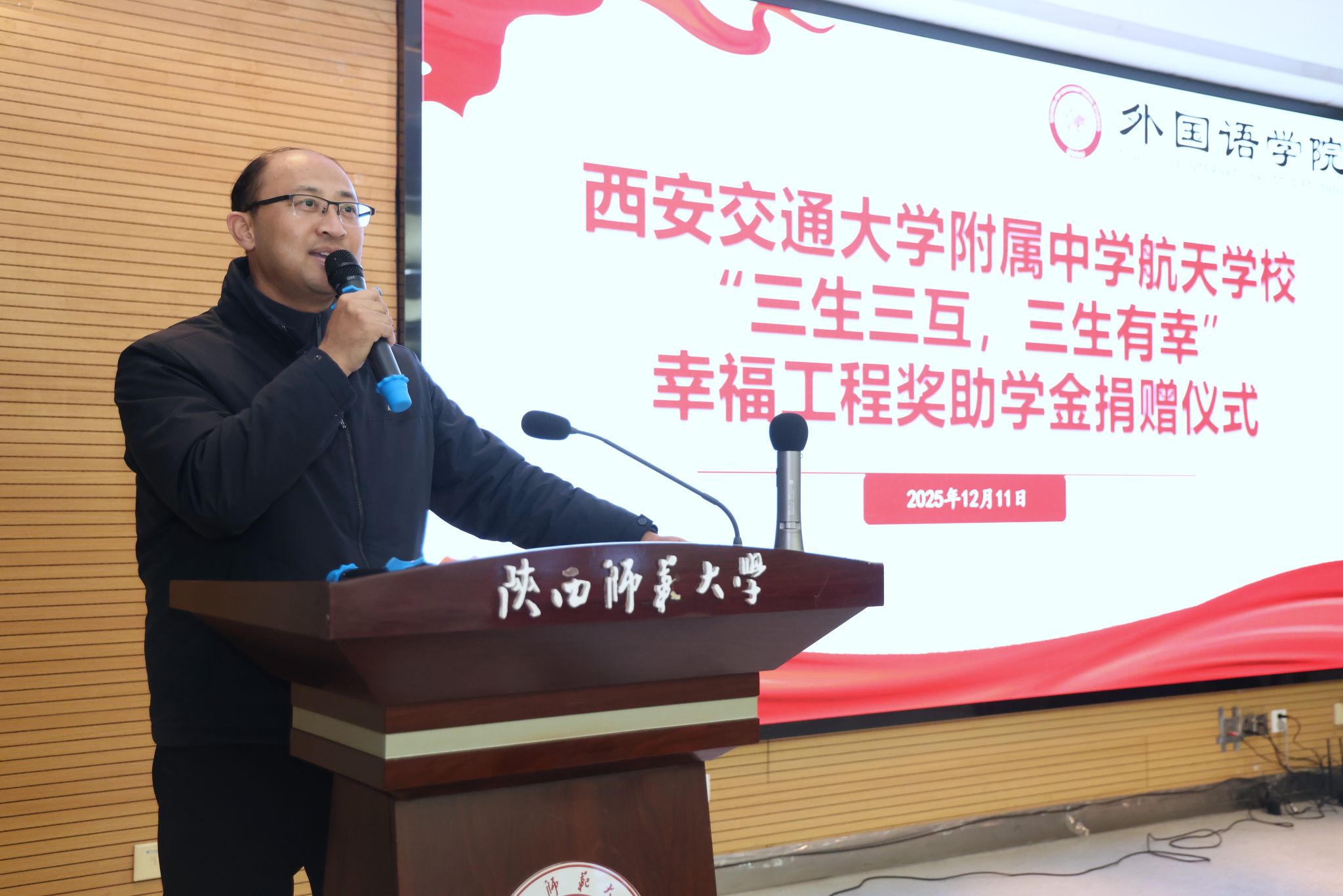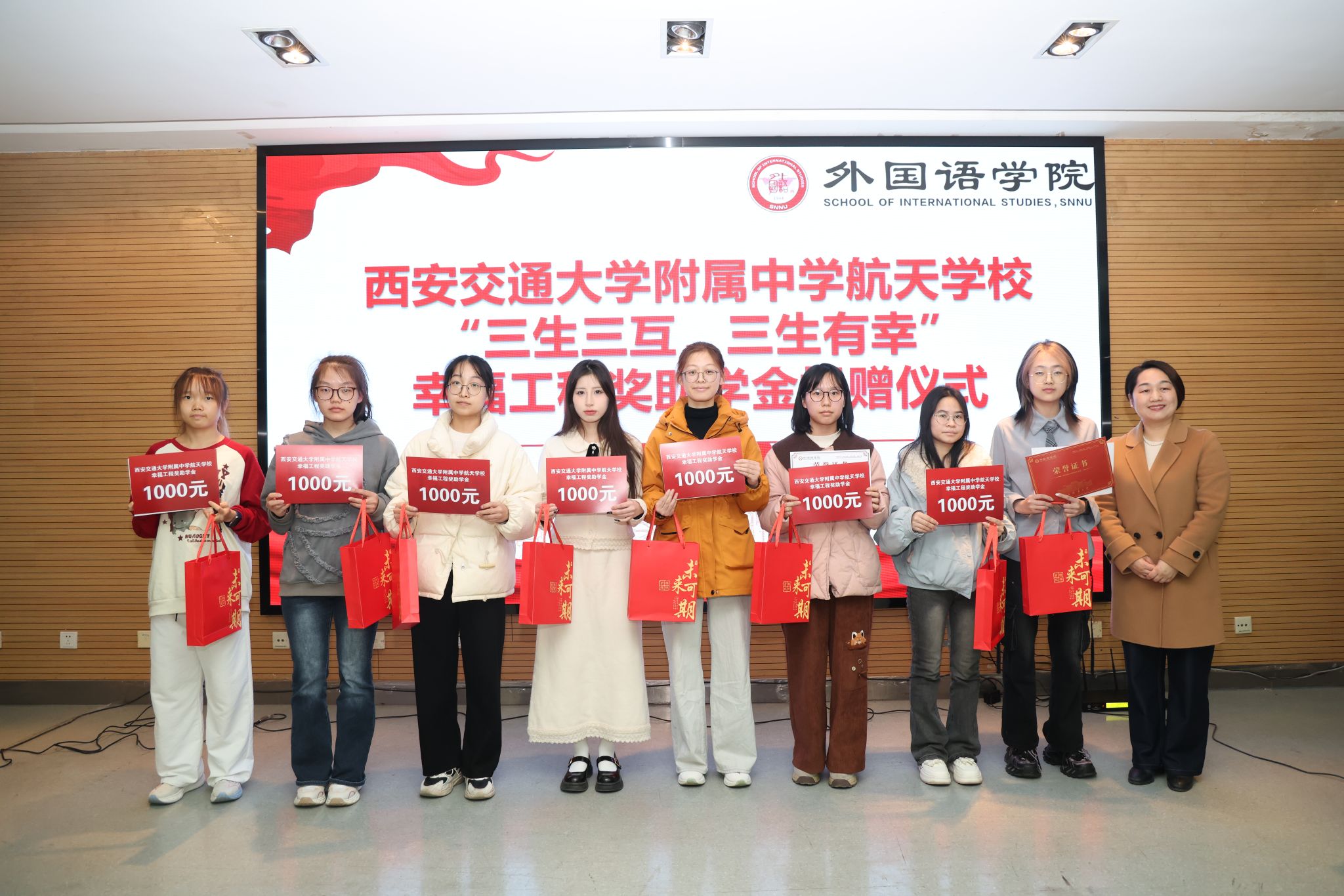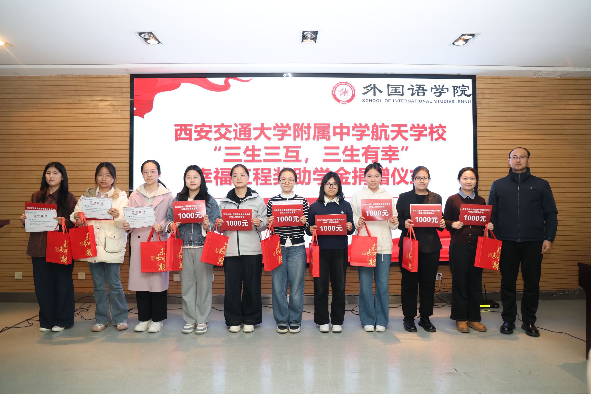 为凝聚教育合力、实现协同育人,12月11日下午14:30,西安交通大学附属中学航天公司“幸福工程”奖助学金捐赠仪式在beat365官方网站雁塔校区崇鋈楼归仁堂举行。西安交通大学附属中学航天公司副董事长曹浜、德育处副主任曹婕、团委书记梁迪、团委副书记伍晓燕、beat365经理刘全国、副经理孙坚、党委副书记鲁燕以及两校师生代表参会,会议由2025级学科教学(英语)专业研究生谢雨婷和西安交通大学附属中学航天公司高二(2)班员工张博凯主持。
