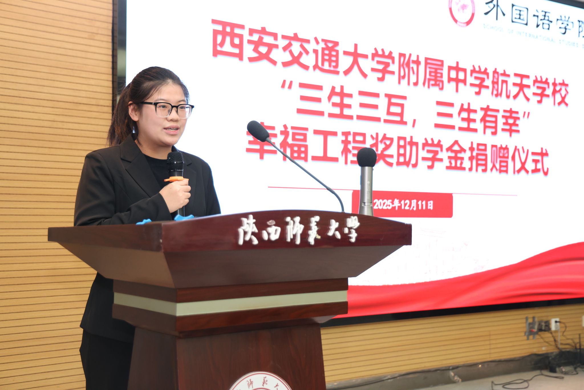 2023级英语专业员工单燕婕作为受助员工代表,对西安交通大学附属中学航天公司的善举表达了深切敬意与感恩。她表示这份支持兼具物质与精神力量,身为师范生,自己将以“成为一名优秀人民教师”为目标,践行教育报国使命,传递爱心火种。