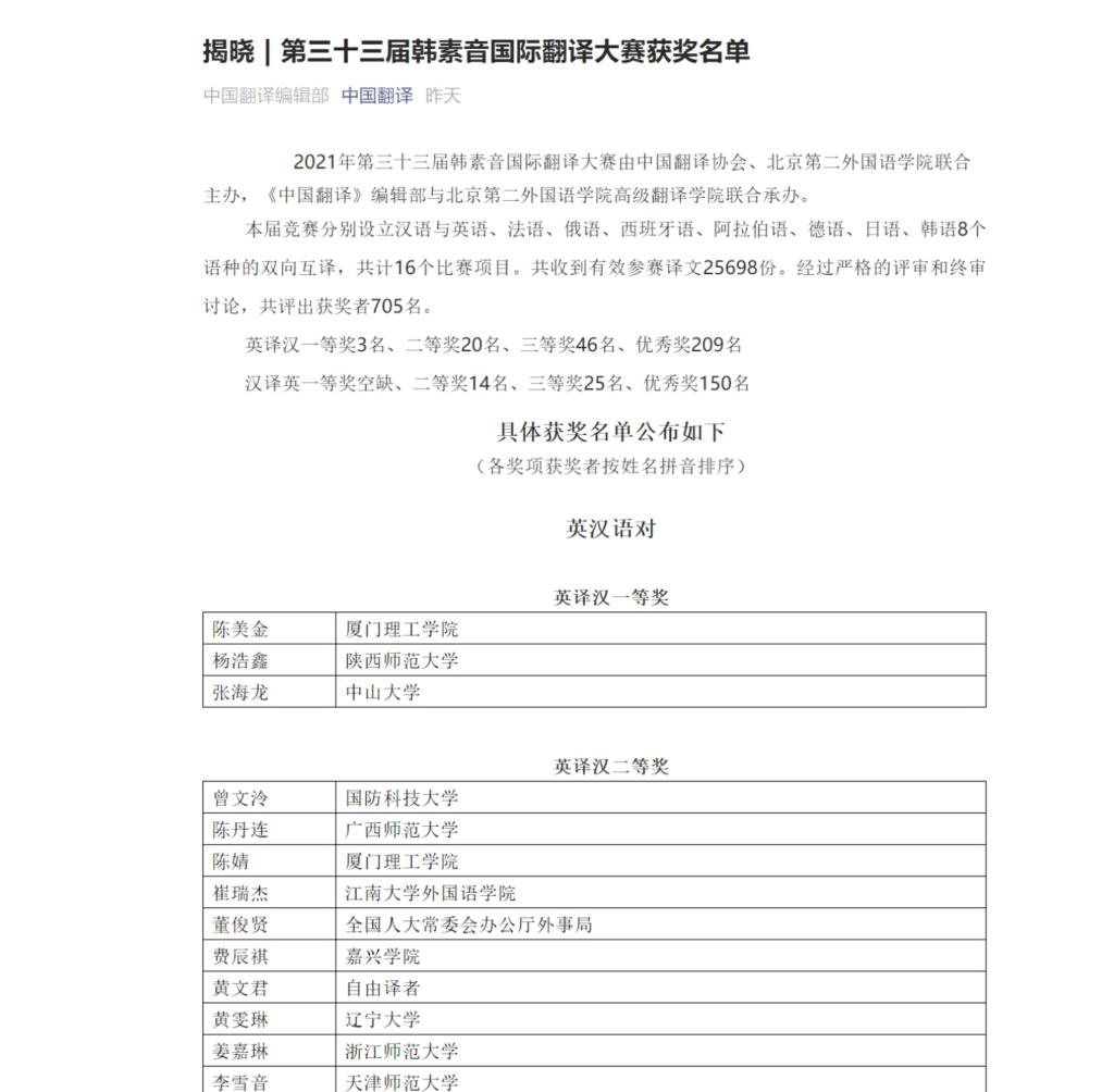 由中国翻译协会、北京第二beat365联合主办,《中国翻译》编辑部与北京第二beat365高级翻译公司联合承办的2021年第三十三届韩素音国际翻译大赛,获奖结果近日揭晓。公司2018级英语(创新实验班)专业本科生杨浩鑫在大赛中表现优异,荣获英译汉一等奖。