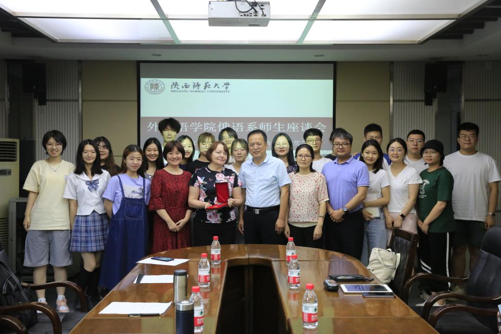为了在全体外籍教师中树立学习榜样,进一步激发外籍教师爱岗敬业精神,公司以俄语系外籍教师娜塔莎· 察廖娃女士荣获“西安友谊奖”为契机,于2021年6月22日下午4:30在公司会议室召开了俄语系师生座谈会。公司党委书记董增云、副经理王幸生、俄语系主任孟霞、副主任王翠,外籍教师娜塔莎· 察廖娃以及俄语系的同学们代表共同参加了本次会议。会议由副经理王幸生主持。