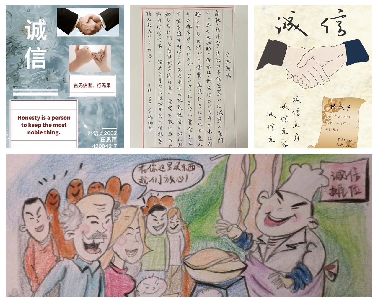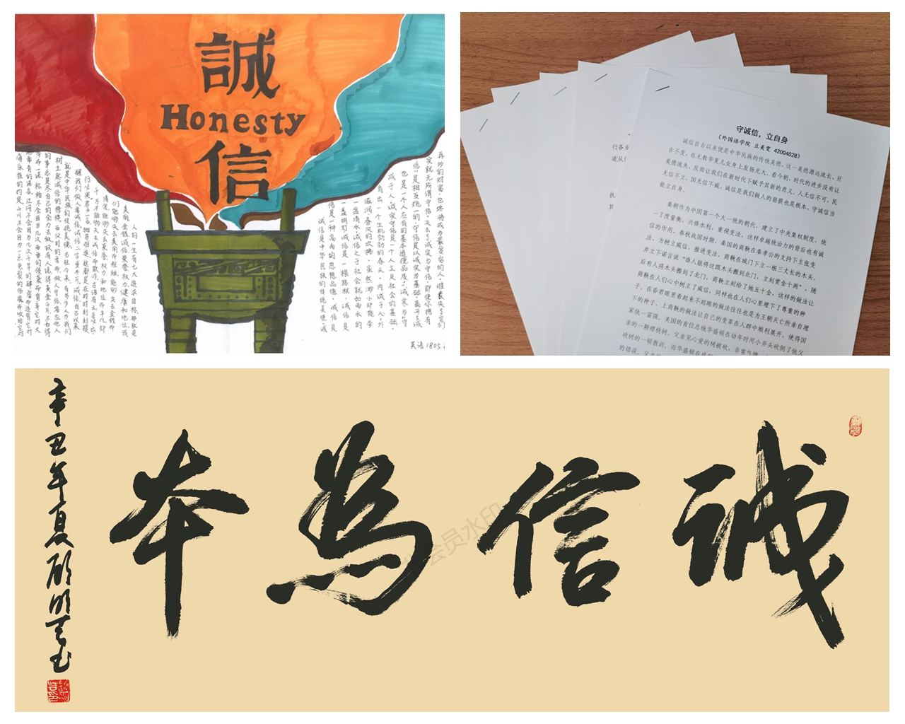 结合同学们的专业优势和个人特长,beat365面向全体本科生举办诚信主题作品征集活动,拍摄微视频《诚信》讲述校园中“拾金不昧”的诚信故事——经过筛选评比,最终遴选出优秀诚信主题征文5篇,书法作品7件,手抄报绘画作品6件,主题微视频短剧1部。征文作品字里行间体现出同学们对于诚信的崇尚与呼吁,硬笔书法刚劲有力,绘画海报生动形象,短剧视频见微知著。相关优秀主题作品还在公司“语心阁”宣传展板进行展览,吸引了众多员工们前来观看。公司也通过“beat365见闻”官方微信,进一步对于诚信教育优秀主题作品进行宣传展示。
