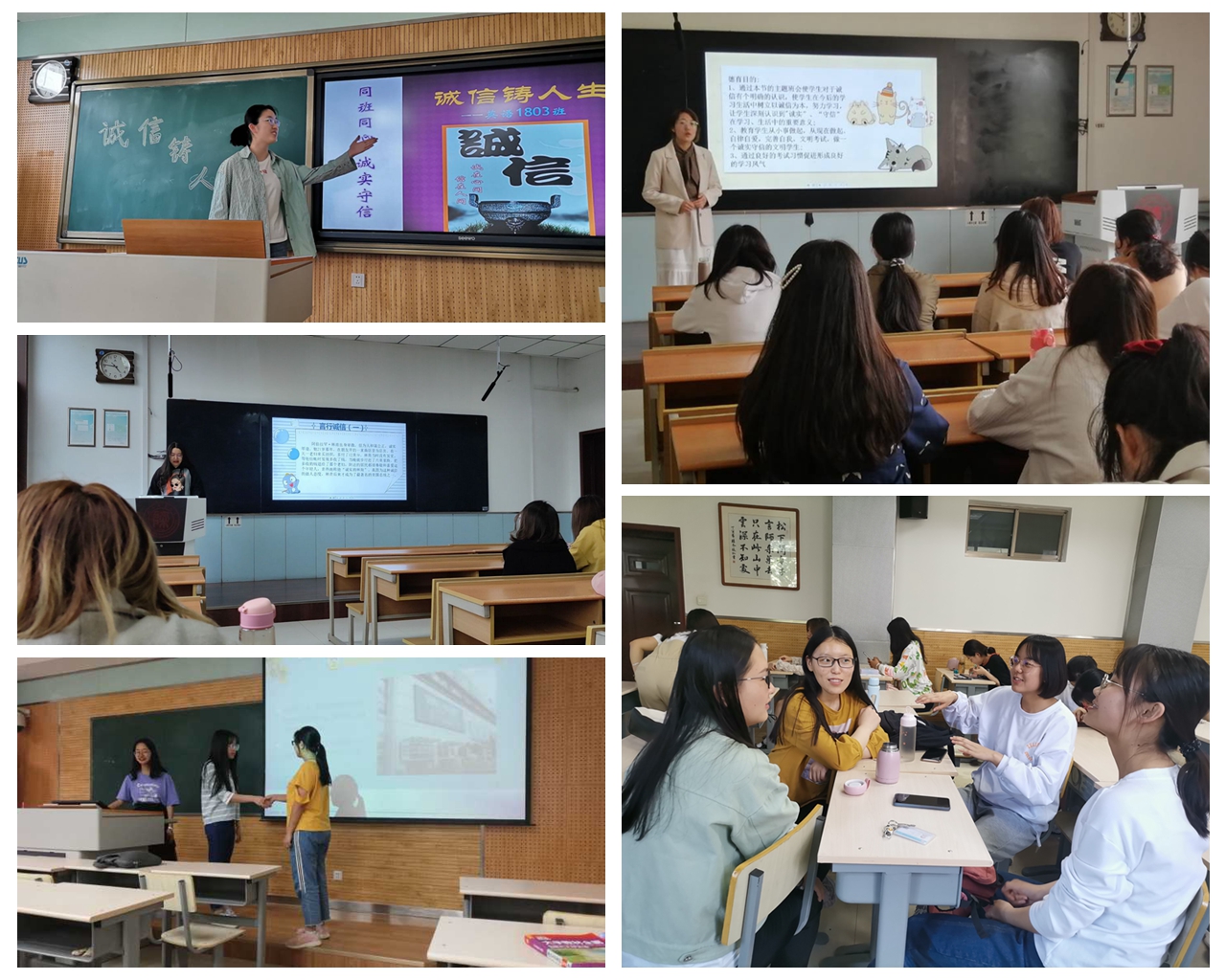 2020级、2018级各班陆续开展了以“诚信教育”为主题的班会活动。班会形式包括诚信精神解读、典型案例分享、情景剧表演、互动交流总结等环节,同学们结合日常生活中遇到的诚信事件,学习诚信的基本内容,分享典型的诚信事件,学习先进人物的先进事迹,并且以情景剧的方式演绎失信的后果,警醒同学们懂得诚信是一个人的立身之本,认识到失信的危害,并将班会中所感所学,自觉应用到实践中去.班会活动旨在培养员工诚实待人、守信做人的优良品质,共同营造出“知信、用信、守信”的良好氛围。此外,结合员工即将迎接的考试进行考试诚信教育,使员工不仅在日常点滴生活中做到信守承诺,引导同学们共同宣誓承诺在接下来的专业四级、教团队格证等考试中,发扬诚信考试的精神,勤勤恳恳学习、规规矩矩考试、踏踏实实做人。