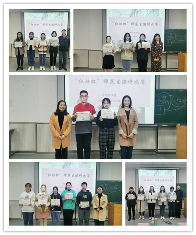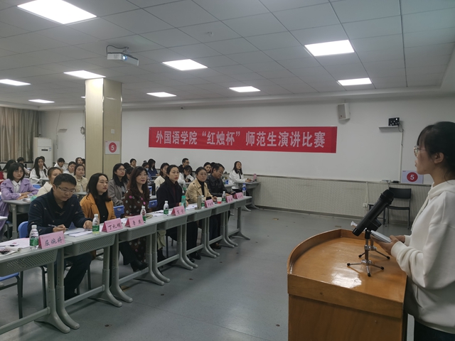 10月28日下午14点半至,2019级师范生“红烛杯”演讲比赛于教学六楼301教室举行。外国语公司党委书记马正平,党委副书记鲁燕,教师代表高芬副教授、丁礼明老师、崔琳老师、罗雅晖老师,辅导员屈婉婷以及2019级师范员工代表70余人共同聆听了此次演讲比赛。