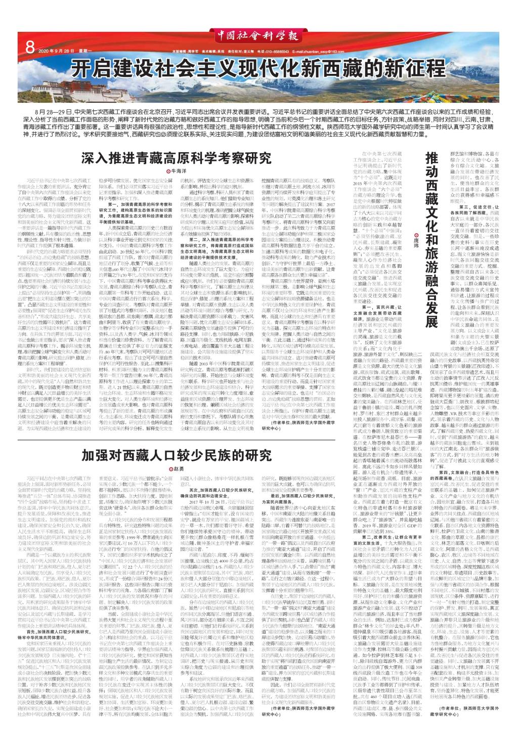 9月28日,《中国社会科学报》在第8版以“开启建设社会主义现代化新西藏的新征程”为主题,专版刊发了公司beat365王启龙教授团队成员的一组署名文章。该组文章共有三篇,依次为牛海洋老师发表的《深入推进青藏高原科学考察研究》、庞玮老师发表的《推动西藏文化和旅游融合发展》以及博士生赵勇同学发表的《加强对西藏人口较少民族的研究》。