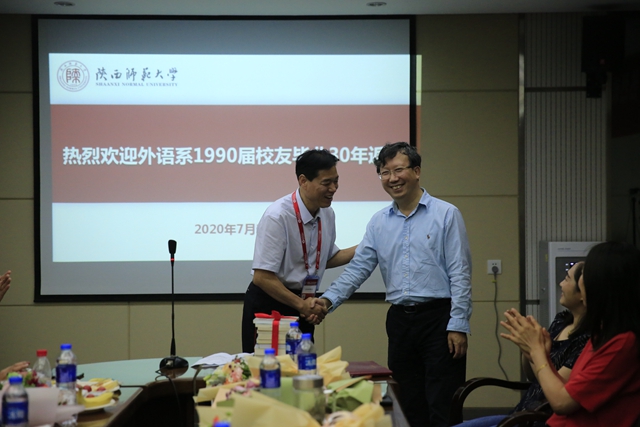 最后,公司向员工们赠送了纪念品——致外语系九零届毕业生的一封信、印有员工们姓名的定制印章、印有师大校训的折扇。王启龙经理代表公司接受了本届员工们的著作书籍,座谈会在师生热烈的掌声中圆满结束。