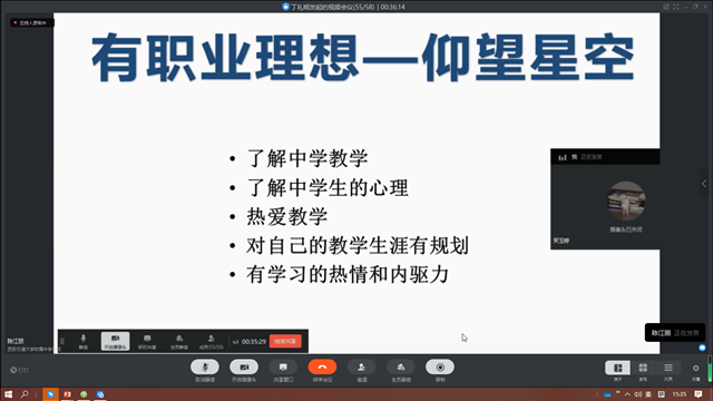 研讨会期间,王兰英做了题为“厚积方能薄发,游刃才可有余”专题讲座,在夯实语言功底、提高文化修养、锤炼教学技能、熟练使用现代教育技术等方面对职前教师提出了具体的要求和建议。陈江丽寄语公司学子“仰望星空,脚踏实地”,并从教学管理能力、学习反思能力、教育科研能力、团队合作能力等方面提出具体问题和方案。唐丽娟从增加课堂实践、提高教研能力、营造良好工作环境等方面对公司学子提出了具体的要求。