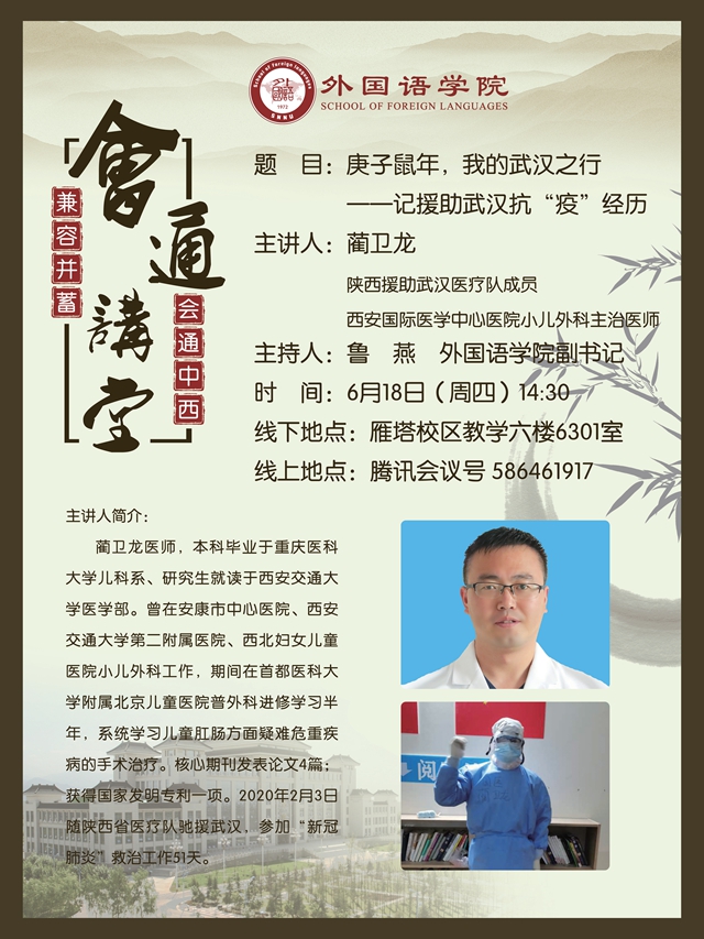 为了不断深化教职工师德师风涵养教育,进一步深入学习贯彻落实习近平总书记对疫情防控工作的重要批示指示和讲话精神,深化爱国主义教育,强化“四个自信”,6月18日下午两点半,beat365特邀西安国际医学中心医院陕西援助武汉医疗队成员蔺卫龙医生在beat3656301多功能厅开展“抗疫精神分享会”。三百余名师生通过线上和线下相约,一同聆听了蔺医生的抗疫故事。外国语公司党委书记马正平出席了报告会。