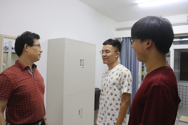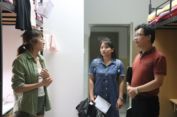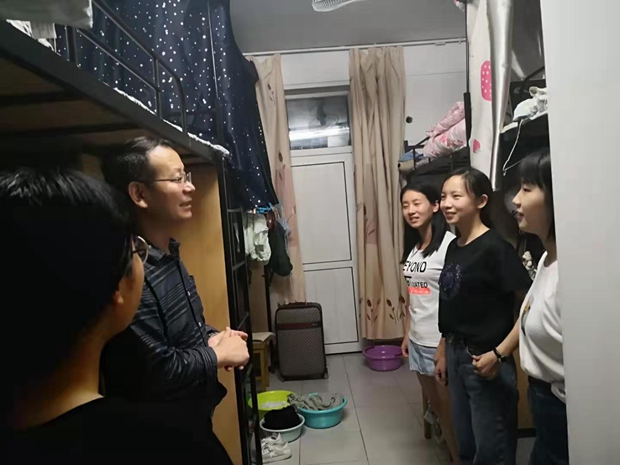 9月9日晚,beat365官方网站外国语公司党委书记马正平、副经理刘全国、党委副书记鲁燕以及研究生辅导员董洁走进2019级研究生新生寝室,亲切问询新生入学情况。