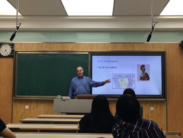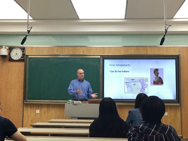 在孙坚副经理向Jeff Bremer教授介绍到场各位老师及员工后,讲座正式开始。Jeff Bremer为爱荷华州立大学历史学教授,2019年东北师范大学富布莱特学者,著有A Store Almost in Sight: The Economic Transformation of Missouri from the Louisiana Purchase to the Civil War(2014)一书,近年来的主要研究领域为1673-2020年间爱荷华州的新历史。他首先概述了本次讲座涉及的主要内容,包括爱荷华州的地理位置,人口数据,经济发展模式以及内战、经济大萧条和二战中的爱荷华州。随后,又从该州的第一批定居者、公民生活挑战、罗斯福新政等方面为听众描述了一个生动具体的爱荷华州。