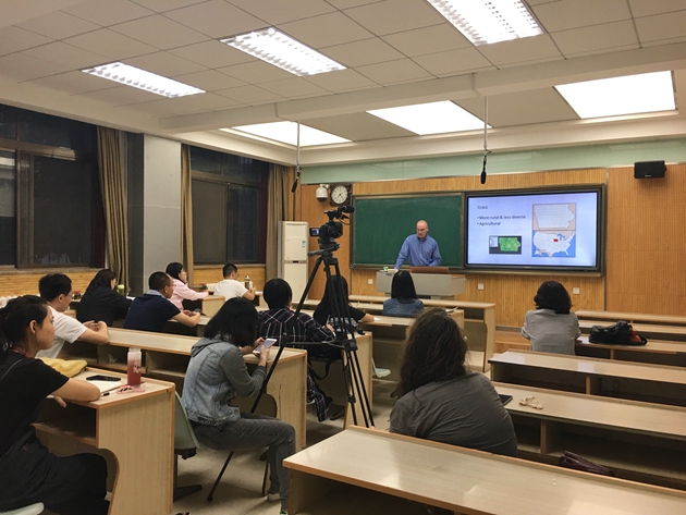 在提问环节中,在场的老师和同学们积极参与,同Jeff Bremer教授畅聊冷战、二战时期女性放弃工作回归家庭的原因、在美国的印度人、美国梦、宪法、以及时下牵动人心的中美贸易战等问题。Jeff Bremer教授指出,贸易战给诸多爱荷华州的农民带来了巨大的损失。