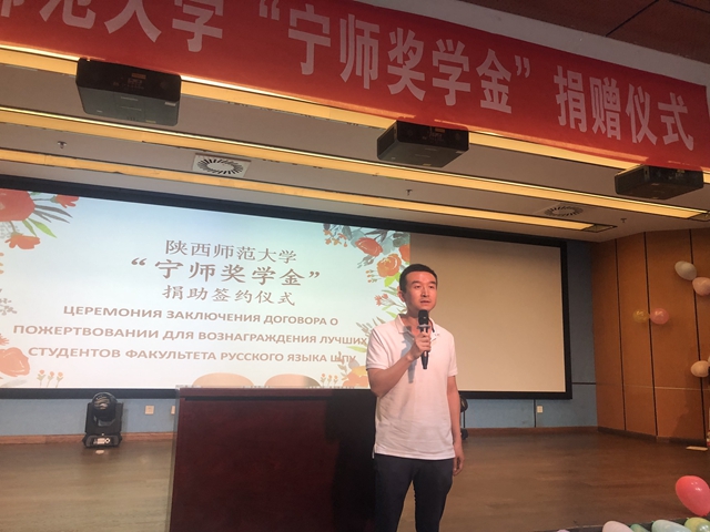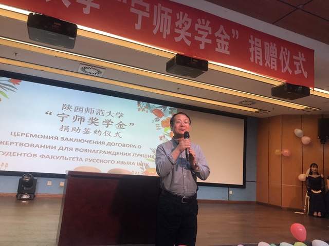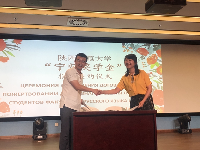 随后,“宁师奖学金”捐助签约仪式正式开始。“宁师奖学金”由公司1972级俄语系首届员工王国宏和其子西安中欧创新技术有限公司总经理宁晶设立,捐助金额共9万元,旨在促进公司俄语人才的培养和俄语系发展。王翠代表俄语系师生向奖学金捐赠人表达了诚挚的敬意和衷心的感谢。宁晶与beat365官方网站教育基金会代表杨高玕现场进行捐赠协议书签约。王国宏老师在发言中回顾了自己与俄语的不解之缘,勉励俄语系员工要珍惜在校时光、打好专业基础,奋发图强,为中俄两国文化的传播贡献自己的力量。宁晶在发言中谈到母亲与师大俄语系的紧密联系,并祝愿师大越办越好。马正平代表公司感谢俄语系员工的无私捐助,他强调这是员工在公司层面设立的第一个奖学金,对员工来说是一笔珍贵的资助,对教师来说是无声的鼓励,一定会用好这笔奖学金,争取培养更多优秀的俄语人才。
