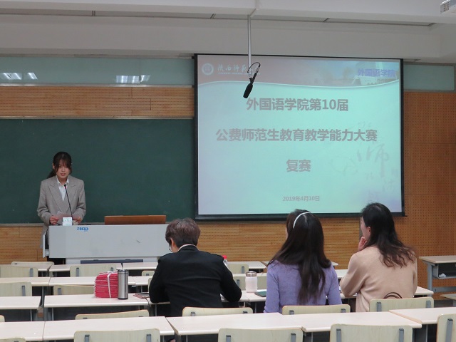 经过英语系办公室赛前统一强训,选手们成绩飞跃,表现优异。他们的课程结构清晰、导入简明、图文并茂、影音丰富、互动高效、气氛活跃,因此现场评委和观众反响强烈。在具体实施教学过程时,他们都详略得当、教具实用,讨论积极。选手们的课堂都源于教材、拓展延伸,深化主题。多数选手别出心裁、创意无穷,赢得了评委和观众的热情掌声。