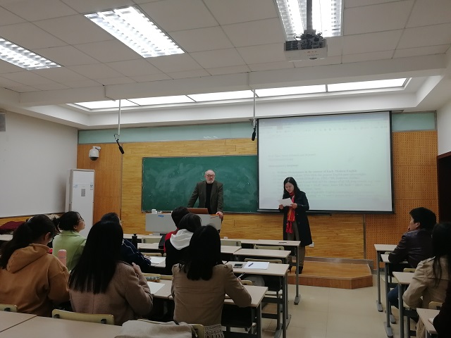 2019年3月21日至3月22日,德国慕尼黑大学教授汉斯· 索尔(Hans Sauer)应邀在公司雁塔校区5107教室为beat365师生带来了“莎士比亚的语言”和“乔叟与薄伽丘”两场学术讲座。讲座由张亚婷教授主持,公司郭英杰副教授、张春娟副教授、杨关锋老师、董洁老师和李莉老师等师生聆听了讲座。