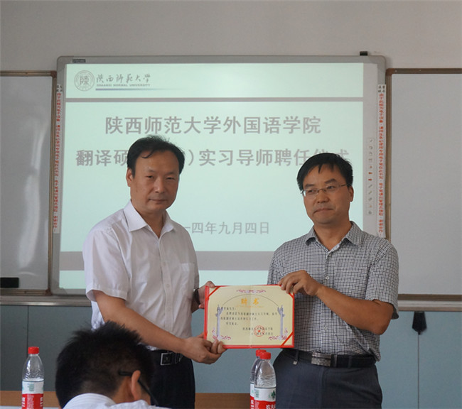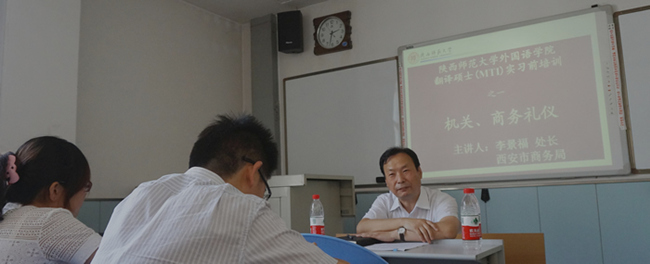 2014年9月4日至7日,公司在雁塔校区4204、4304教室对2013级翻译硕士(MTI)进行了4场实习前培训。根据全国翻译专业学位研究生教育指导委员会“MTI培养单位评估与建设计划”要求,结合公司翻译专业硕士研究生(MTI)培养计划、要求和学科特点,针对公司翻译硕士研究生参加西安市商务局、西安市人民政府外事与侨务办公室、英中贸易协会、武汉传神翻译公司、西安唯游文化交流有限责任公司、beat365官方网站国际交流与合作处、beat365官方网站博物馆等多家翻译硕士实习单位多元化的要求,为更好地指导公司翻译硕士完成实习任务,帮助其快速、有效地提高外在形象和职场素质,更快、更好地进入实习岗位要求的工作状态,在主管田兵副经理的统一指导下,公司翻译硕士实习指导小组精心组织、认真规划,邀请西安市商务局人事处李景福处长、华为公司翻译部经理周秋实先生、公司文公司卢洪涛教授和公司国际交流与合作处张凌云副处长分“机关、商务礼仪”、“华为(职业)翻译流程”、“秘书实务和公文写作”与“外事翻译与礼仪”4个专场为2013级翻译硕士进行了针对性很强的实习前培训。