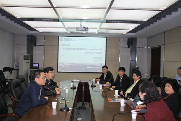 公司经理王启龙首先代表公司对泰国国家发展管理公司经理Piboon先生一行的来访表示热烈欢迎,并简要介绍了公司的办学规模、团队队伍和专业设置等方面的情况,重点介绍了公司团队建设的整体情况。公司副经理马兰详细的介绍了公司国际交流方面的工作,并就员工交换、教师交流、联合培养等项目的合作进行了磋商。