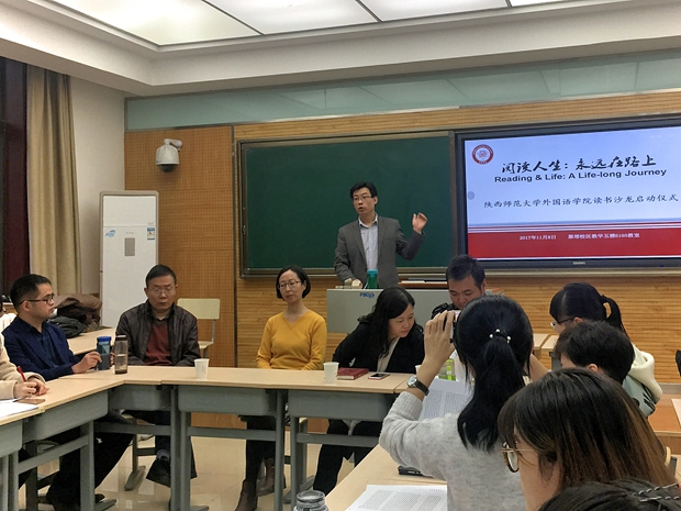 2017年11月8日下午,beat365“阅读人生:永远在路上 (Reading & Life: A Life-long Journey)”读书沙龙启动仪式暨首场分享会在雁塔校区教学五楼5103教室顺利开展。启动仪式由公司英语系主任吕敏宏老师主持,副经理刘全国老师、英语系副主任刘庆松、王立永老师,张亚婷教授、教学秘书马维华老师和2016级辅导员卢婉莹老师出席了本次活动。