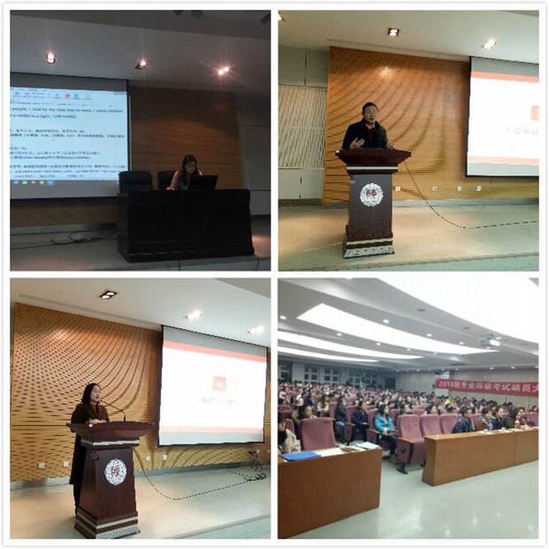 明年四月,2016级英语专业的同学们将迎来英语专业四级考试,此次动员大会通过题型讲解,备考经验分享等,为紧张备考专四的同学们树立信心、加油鼓劲,相信经过大家的不懈努力,2016级英语专业的同学们定当不负众望,在考试中再创佳绩!