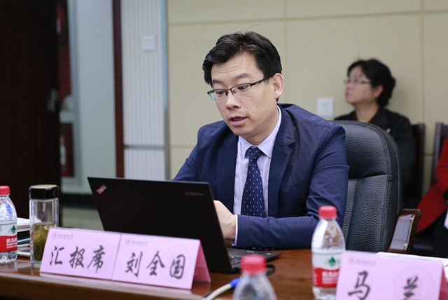 随后,副经理刘全国代表公司就本科教学工作情况进行了自评汇报,汇报从公司概况、特色与举措、存在问题与改进措施三部分展开。报告梳理了公司的历史沿革及近年来取得的学科荣誉,如2015年、2016年分别获批国家社科基金项目8、9项,立项数在全国同类院校中均居首位;2018年,公司获批外国语言文学一级博士学位授权点。这些成绩无疑是对公司近年来工作和发展的肯定,也为公司师生提供了继续奋斗的不竭动力。报告重点展示了公司在人才培养、制度建设、学术资源建设、学风建设、课程群建设、海外实习、公共英语教学等七个方面的特色与举措,同时也结合自评结果对公司本科教学工作目前存在的问题和相应的改进措施进行了汇报。