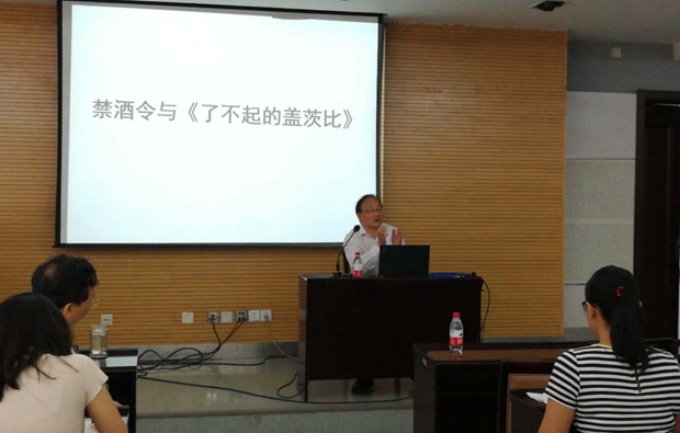 王经理首先对虞建华教授做了简要介绍。之后虞教授的讲座在一阵热烈的掌声中展开。该讲座主要从文本外的角度解读了著名小说《了不起的盖茨比》。此小说的背景正值美国实行禁酒令时期,虞教授以小说中的饮酒场景描写作为切入点,挖掘隐藏在此小说中的文化符号——酒,从而揭示了新旧势力下的价值观对抗,使我们从一个全新的视角重新认识了这部经典著作,在座师生均感到受益匪浅。