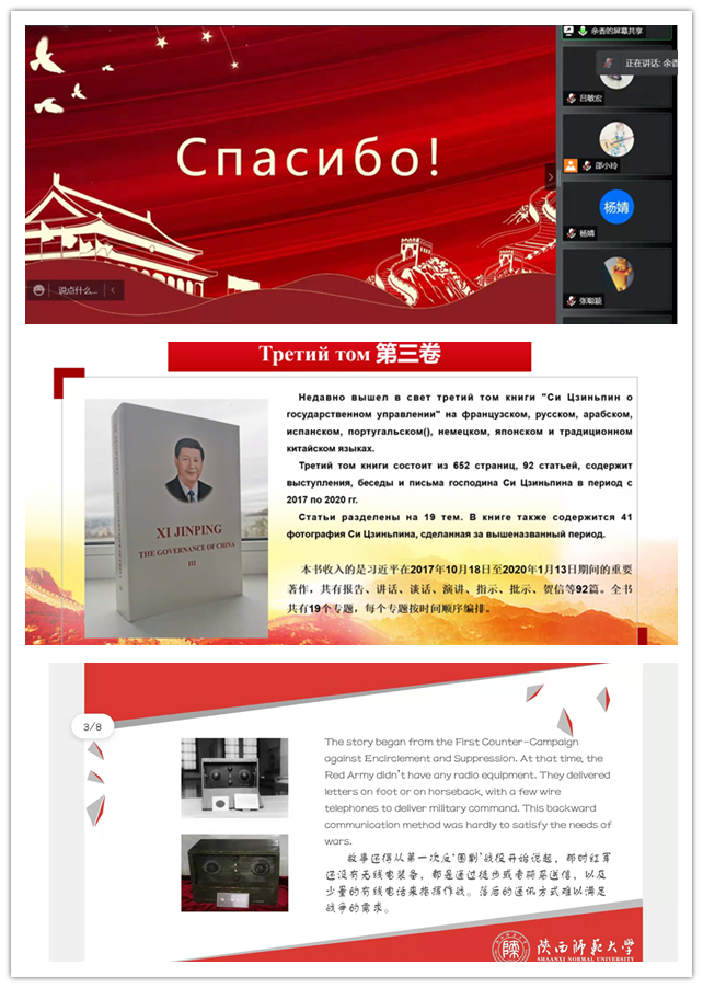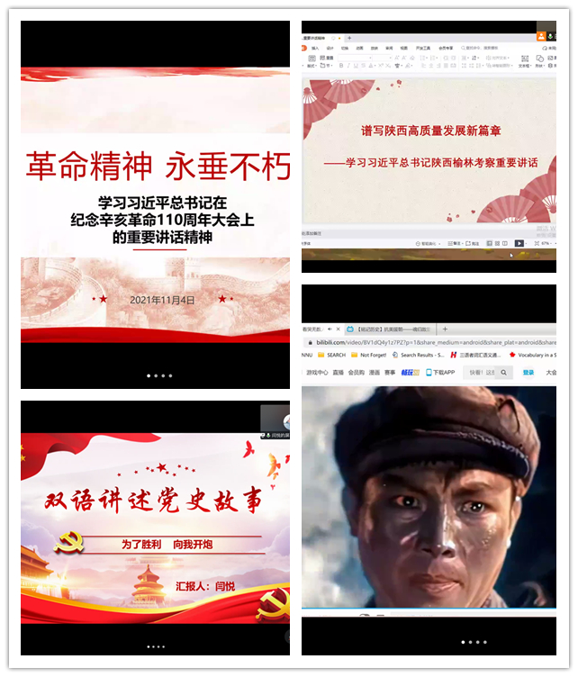首先,在双语讲述党史故事环节中,外国语言学及应用语言学专业的闫悦同志用中英双语讲述了抗美援朝和上甘岭战役,以影片的形式呈现英雄儿女的故事和代代相传的红色精神,并表示“请党放心,强国有我”,号召青年党员肩负起使命和职责,将自己的梦想与祖国的发展相结合。俄语语言文学专业的余香同志用中俄双语就《习近平谈治国理政》的译介进行了介绍,进一步使党史学习的严谨性与专业特色的学术性相结合。之后,英语语言文学专业的燕晨雯同志用中英双语讲述了“一部半电台”的说法起源,详细讲解了为红军屡建奇功的电台并结合现代新闻业指出了红色电信事业的发展。