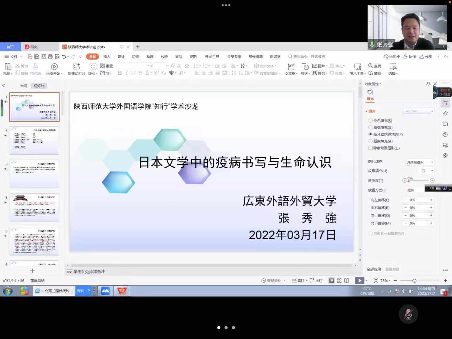 2022年3月17日下午,beat365“知行”系列学术沙龙“日本文学中的疫病书写与生命认识”在腾讯会议上举办。本次沙龙由东北亚与欧洲研究学科团队主办,广东外语外贸大学张秀强教授主讲,公司曹婷副经理主持,beat365日语系及校外师生近40人参加。
